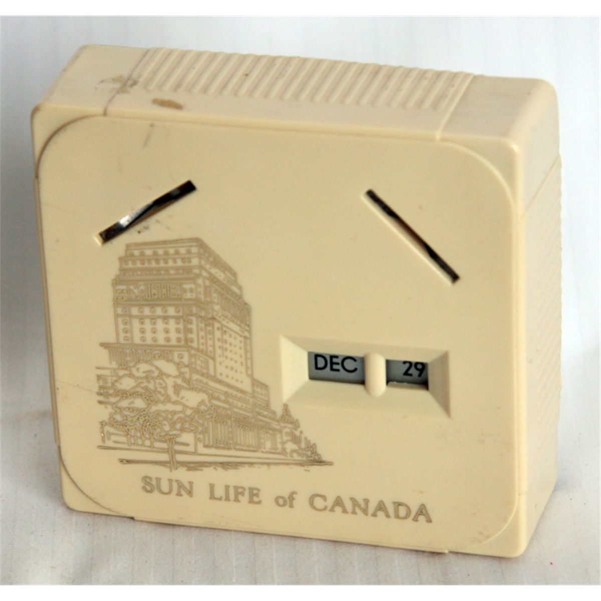 SUN LIFE OF CANADA. A rectangular Coin Calendar bank. Two coin slots on front. Currency slot on back. 10cm x 10cm x 3 1/2cm. Cream coloured plastic. Day/Date counter on front. EF.