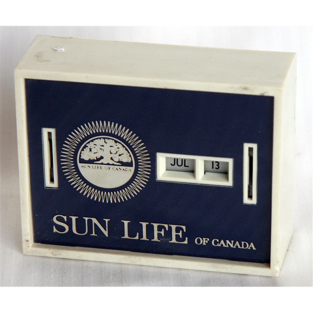 SUN LIFE OF CANADA. A rectangular Coin Calendar bank. Two coin slots on front. Currency slot on back. 10cm x 8 1/2cm x 3 1/2cm. Cream coloured plastic. Day/Date counter on front. EF.