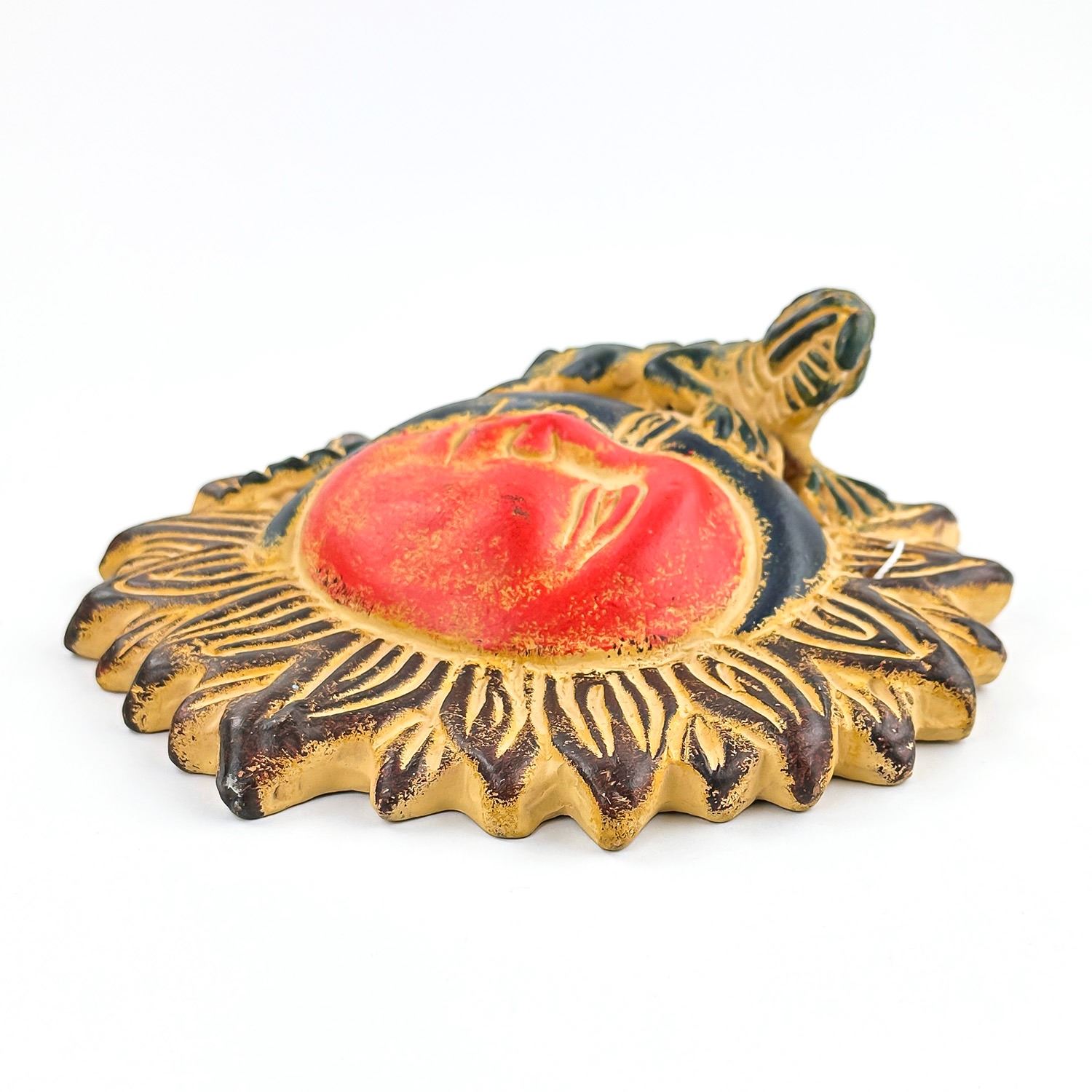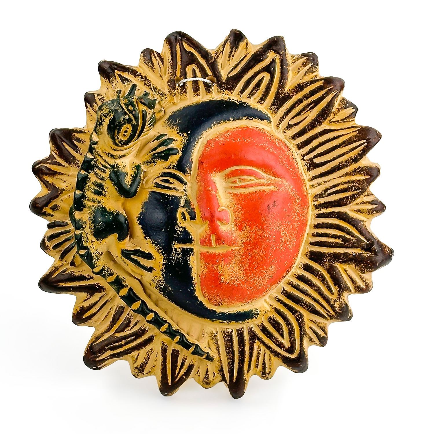 #8196 - HAND CRAFTED HOME OR OFFICE WALL HANGING DECOR. SUN, MOON, FACE & LIZARD POTTERY SCULPTURE. UNMARKED - AGE AND ARTIST UNKNOWN - MEXICO MEXICAN?. MEASURES: 9.5” (24 CM) IN DIAMETER AND 3.125” (8 CM) DEEP