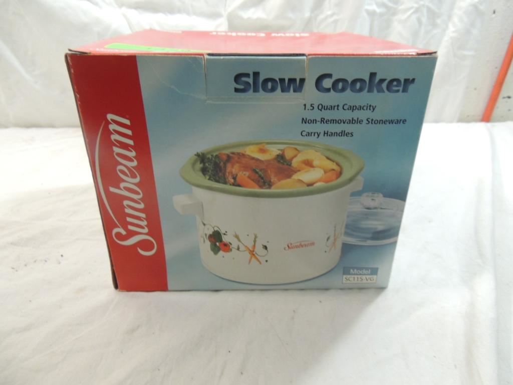 1.5 QUART CAPACITY SLOW COOKER, NON REMOVABLE STONEWARE CARRY HANDLES, SUNBEAM NEW IN BOX AS SHOWN SEE PHOTO FOR MORE DETAILS.