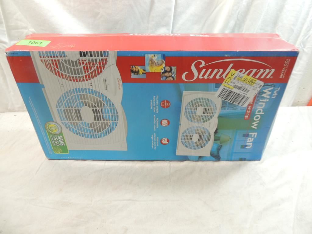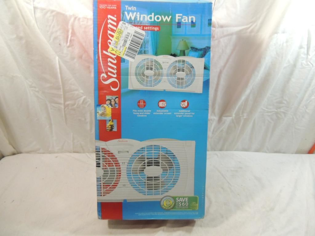 NEW IN BOX SUNBEAM TWIN WINDOW FAN 2 SPEED SETTINGS ADJUSTABLE EXTENDER SCREEN SLIM PRODUCT DESIGN AS SHOWN SEE PHOTO FOR MORE DETAILS.