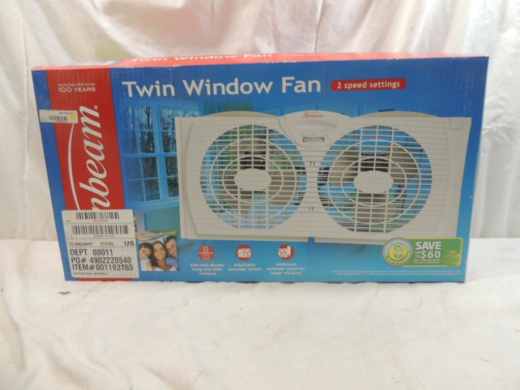 NEW IN BOX SUNBEAM TWIN WINDOW FAN 2 SPEED SETTINGS ADJUSTABLE EXTENDER SCREEN SLIM PRODUCT DESIGN AS SHOWN SEE PHOTO FOR MORE DETAILS.