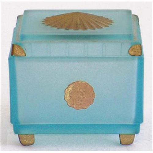 This lovely footed blue Depression satin glass powder jar was produced by Taussaunt Glass. Known as Sunburst it is shown and described on pg 57 in Whitmyer: - Bedroom & Bathroom Glassware of the Depression Years. It measures about 3 7/8" x 3 7/8" x 2" deep. There are gold painted tips on each corner of the lid, on each foot and a gold painted star burst design on the top. The bottom is marked Taussaunt Glass. The original Dermay of 5th Ave. sticker, with an art deco lady wearing a flowing scarf, is still on the jar and says 'Dermay Parfumers Bath Powder - Paris New York'. Slight wear to the gold paint otherwise both the jar and lid are excellent condition