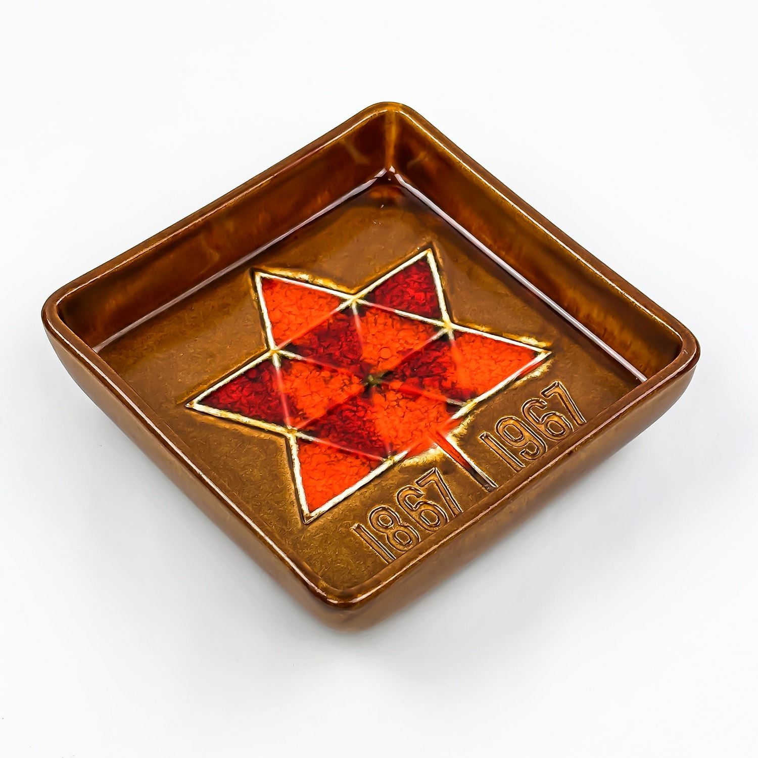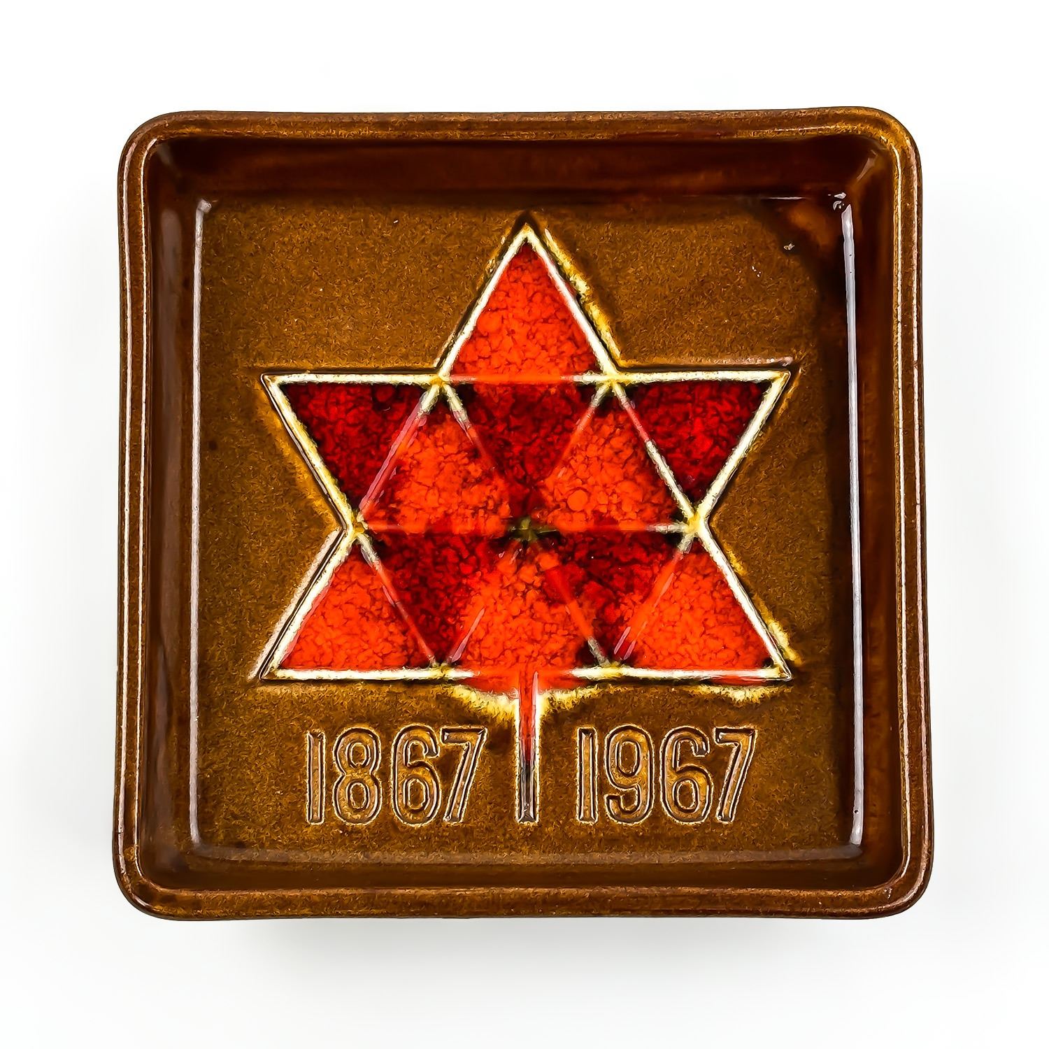 #8667 - VINTAGE SUNBURST CANADA POTTERY - CANADIAN CENTENNIAL ASHTRAY OR DISH. SUNBURST WAS THE LAST POTTERY TO FIRE IT’S WARES IN THE OLD MEDALTA KILNS IN MEDICINE HAT, ALBERTA. MEASURES: 5.75” (14.5 CM) SQUARE BY 1.5” (4 CM) HIGH***ITEM(S) LOCATED IN LETHBRIDGE ALBERTA. FREE TRANSPORT TO EDMONTON OFFICE AVAILABLE FOR THIS AUCTION. WORLDWIDE SHIPPING IS AVAILABLE FOR ALL ITEMS