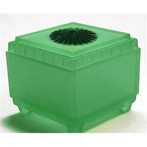 <table width="100%" border="0" cellspacing="0" cellpadding="4"><tr><td><em> </em></td></tr><tr> <td width="100%"> This lovely footed green Depression satin glass powder jar was produced by Taussaunt Glass. Known as Sunburst it is shown and described on pg 57 in Whitmyer: - Bedroom & Bathroom Glassware of the Depression Years. It measures about 3 7/8" x 3 7/8" x 2" deep. There are gold painted tips on each corner of the lid, on each foot and a gold painted star burst design on the top. The bottom is marked Taussaunt Glass. The original Dermay of 5th Ave. sticker, with a nude art deco lady wearing a flowing scarf, is still on the jar and says 'Dermay Parfumers Bath Powder - Paris New York'. Moderate wear to the gold paint otherwise both the jar and lid are excellent condition </td></tr><tr> <td> </td></tr><tr> <td>Reference #: aaGSBSGPJ</td></tr><tr><td>Condition:Excellent</td></tr><tr><td>Year:1930s</td></tr><tr><td>Title:SUNBURST Green Satin GlassTaussaunt Powder Jar</td></tr><tr><td>Location:Orlando, Florida</td></tr></table>