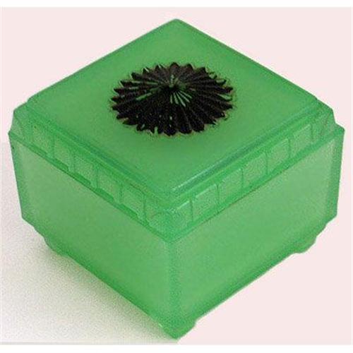 This lovely footed green Depression satin glass powder jar is marked 'Taussaunt Glass'. Known as Sunburst it is shown and described on pg 57 in Whitmyer: - Bedroom & Bathroom Glassware of the Depression Years. It measures about 4 inches cubed The bottom is marked Taussaunt Glass. With the exception of some wear to the black paint on the finial, both the jar and lid are in excellent condition