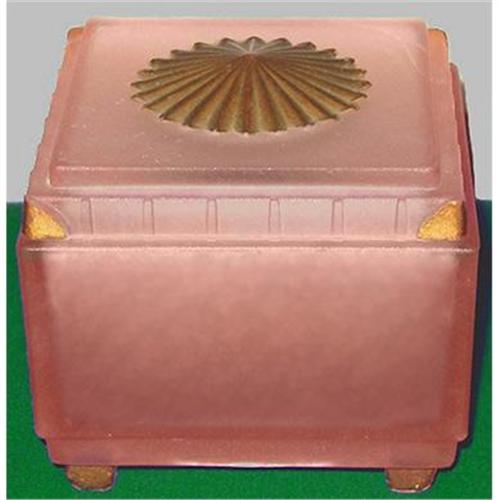 </font></strong>Produced by Taussaunt circa 1930s this gold footed pink frosted glass powder jar is known as SUNBURST and is shown on pg 57 in Margaret Whitmyer - Bedroom & Bathroom Glassware of the Depression Years. It measures about 3 7/8 x 3 7/8 x 2 inches deep. There is gold painted tips on each corner of the lid and a gold painted star burst design on the top. Slight wear to the gold paint but otherwise in excellent condition</font>