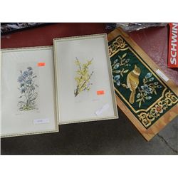 SILK EMBROIDERED BIRD PICTURE & 2 FRAMED SIGNED DRAWINGS = 3PC TOTAL