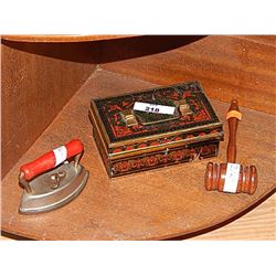 VINTAGE SAD IRON (DISPLAY MODEL), METAL TIN & MINI WOOD GAVEL