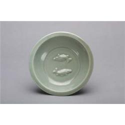 Of outstanding color, Chinese Southern Sung Dynasty, celadon glazed "marriage" dish with appliquT Buddhist double fish emblem on interior and petal-like "ribbed" exterior; D: 8 5/8"