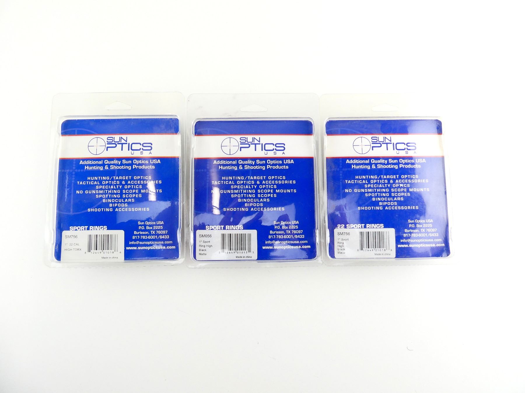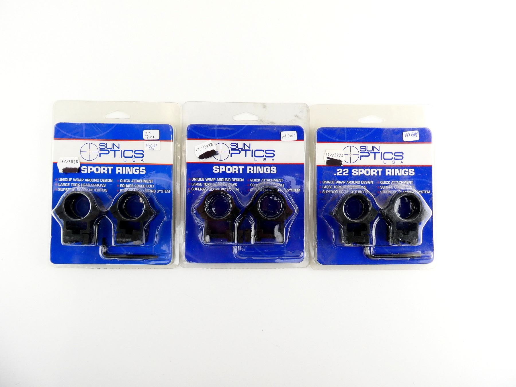 LOT INCLUDES; (2) HIGH .22 SPORT RINGS, 1" DIAMETER, ITEM #: SM756, APPEARS NEW OLD STOCK, IN ORIGINAL PACKAGING & (1) HIGH SPORT RINGS, 1" DIAMETER, ITEM #: SM056, APPEARS NEW OLD STOCK, IN ORIGINAL PACKAGING. MAY REQUIRE FITTING. SEE PHOTOS.