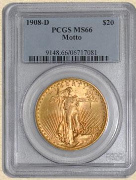 1908-D $20 St. Gaudens MS66 PCGS with Motto