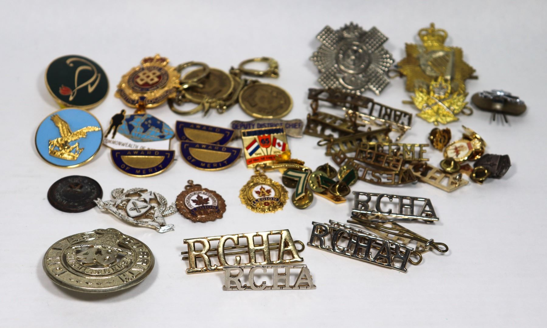ASSORTED PINS INCL. HOLLAND 48TH HIGHLANDERS CAP BADGE MIXED MILITARY INSIGNIA 2 LARGE CAP BADGES MIXED SHOULDER TITLES WWII CANADAMIXED MILITARY SHOULDER TITLES 3 COLD WAR CANADIAN MILITARY PINS 3 LETHBRIDGE SHOOTING MEDALS 1998 4 ASSORTED MILITARY INSIGNIA***ITEM(S) LOCATED IN LETHBRIDGE ALBERTA, FREE TRANSPORT TO OUR EDMONTON OFFICE AVAILABLE. WORLDWIDE SHIPPING IS AVAILABLE***