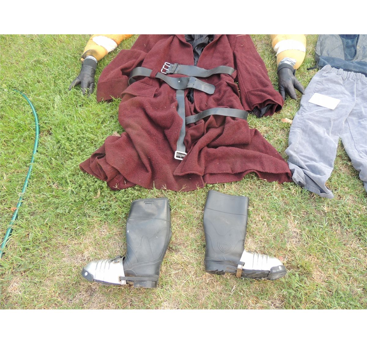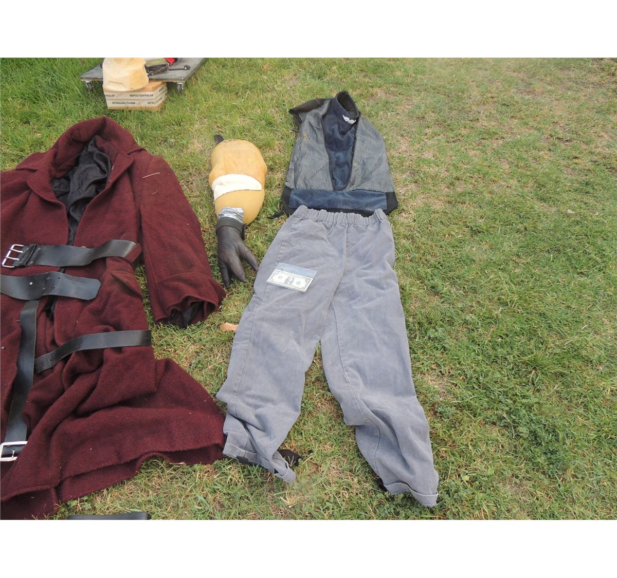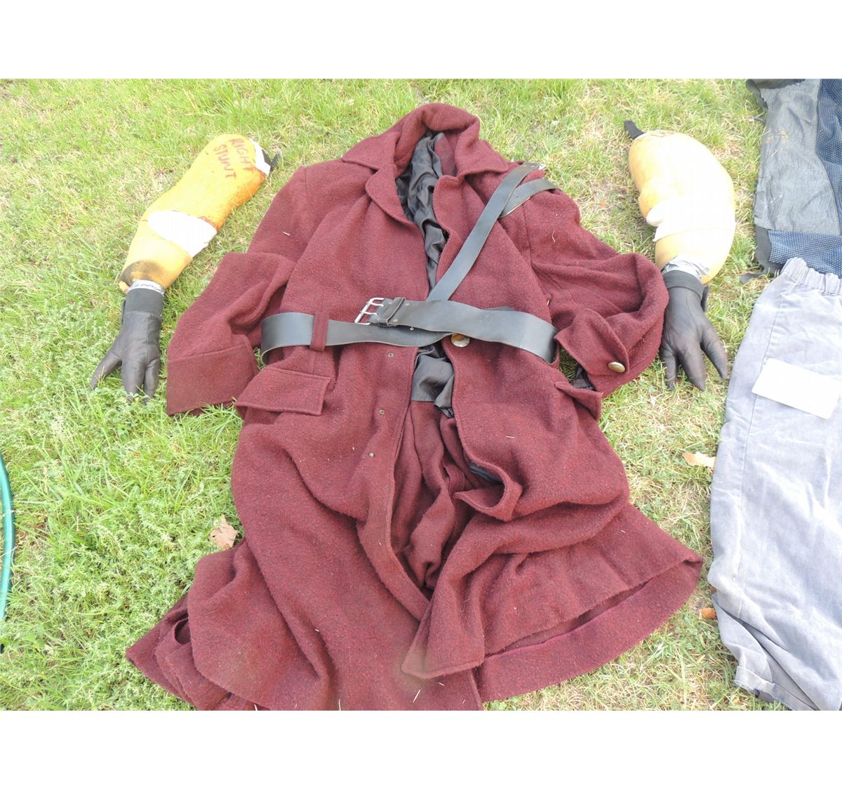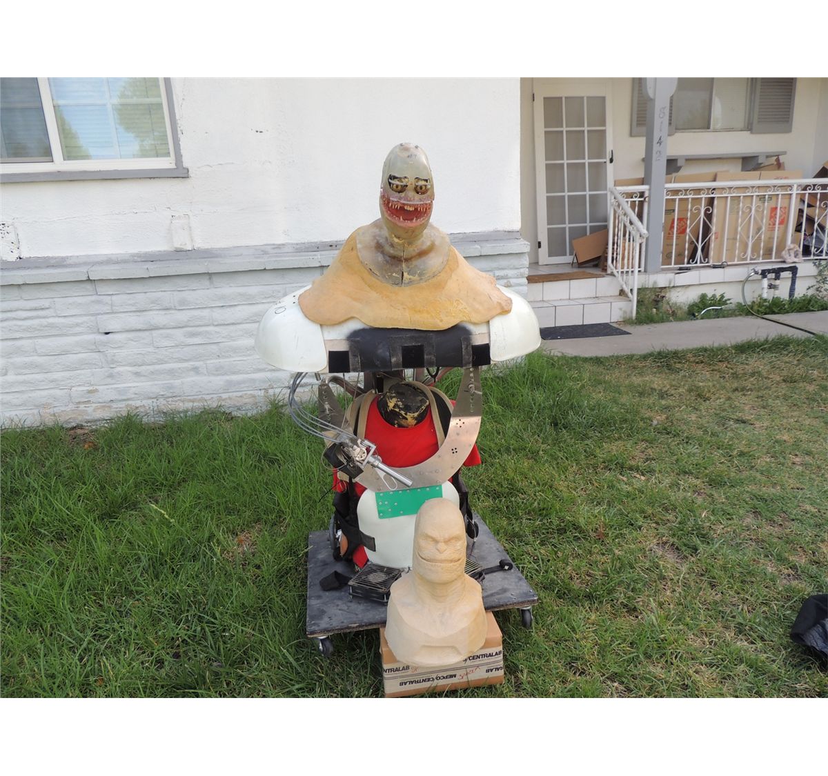 This lot includes all you see, and more. The complete wearable animatronic rig on roll around display stand, the Maroon wool over coat with all patches and belts, gray mesh vest with neck pin, gray pants, boots with steel toes, and both arms with gloves.