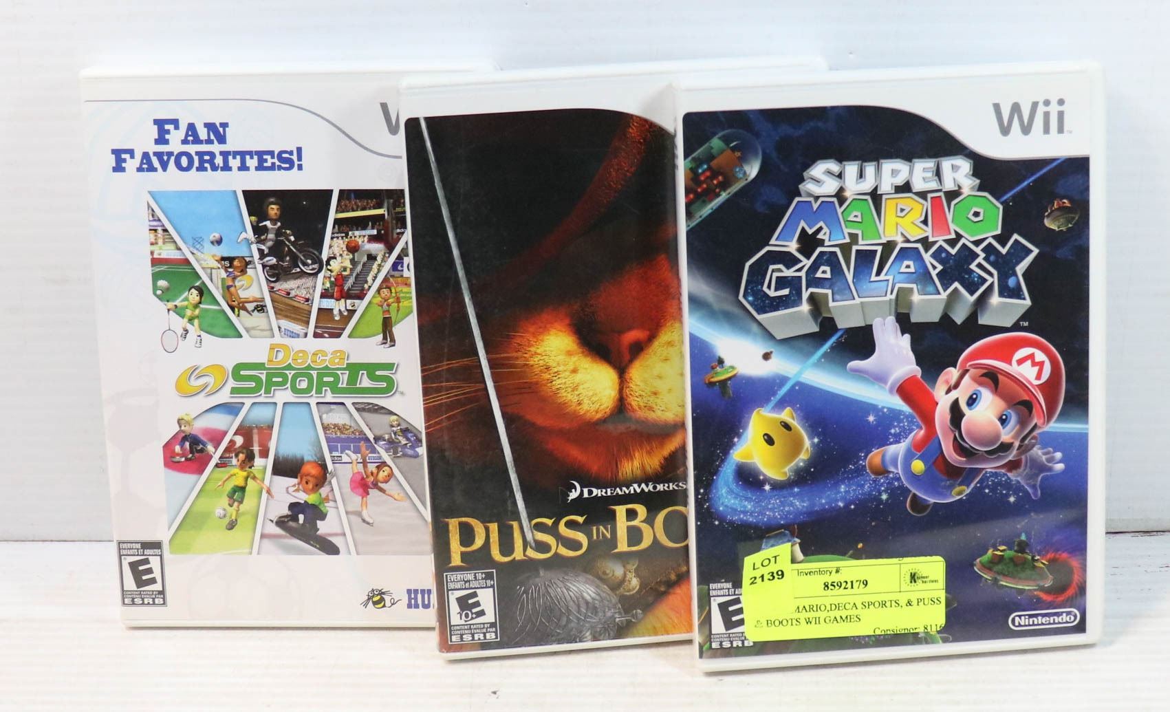 SUPER MARIO,DECA SPORTS, & PUSS & BOOTS WII GAMES
