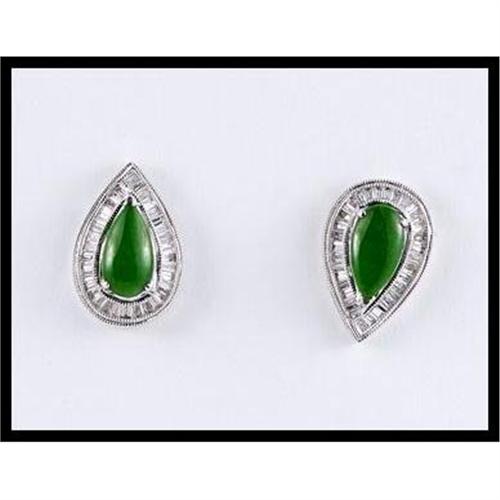 These earrings are elegant and charming. 2 pear shaped green jades are set in 18K white gold with 68 taper beguette diamonds that weigh .35 carats TW. The earrings measure 23 millimeters (1/2 inches) x 9 millimeters (11/32 inches).