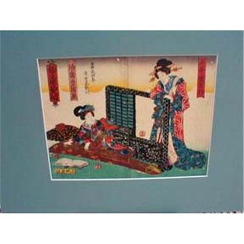 SUPERB mid-19th c. wood block print by Toyokuni of two women