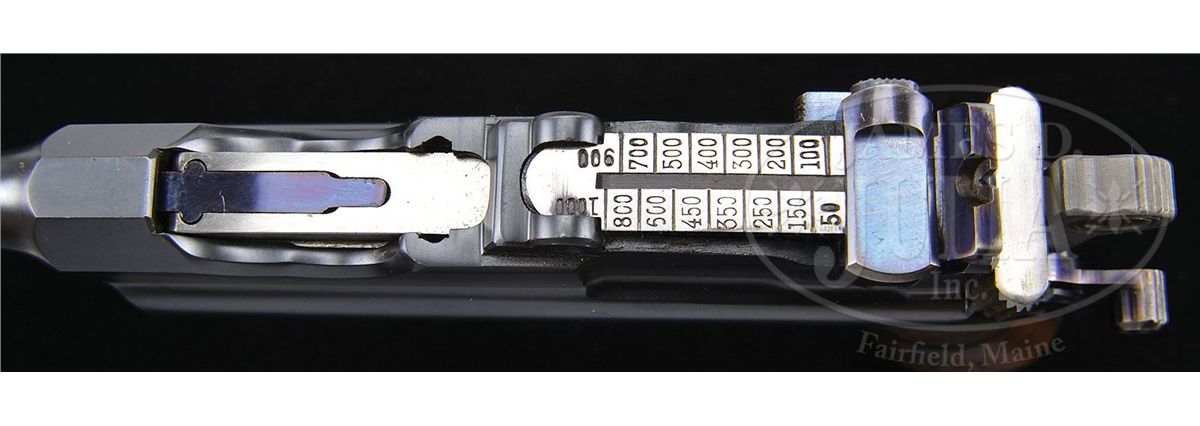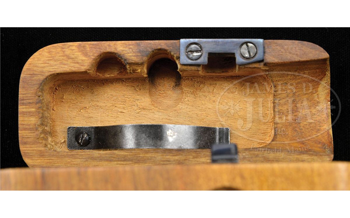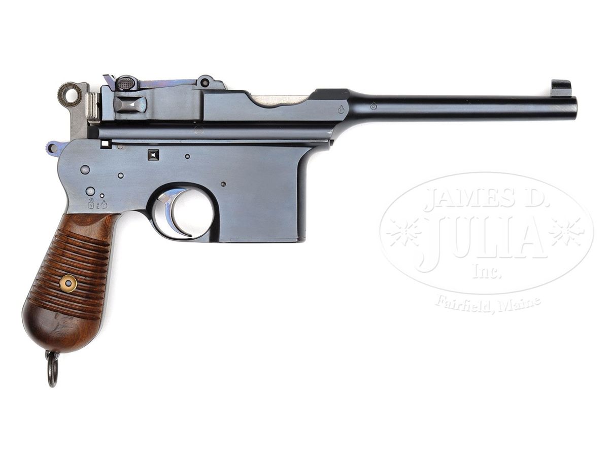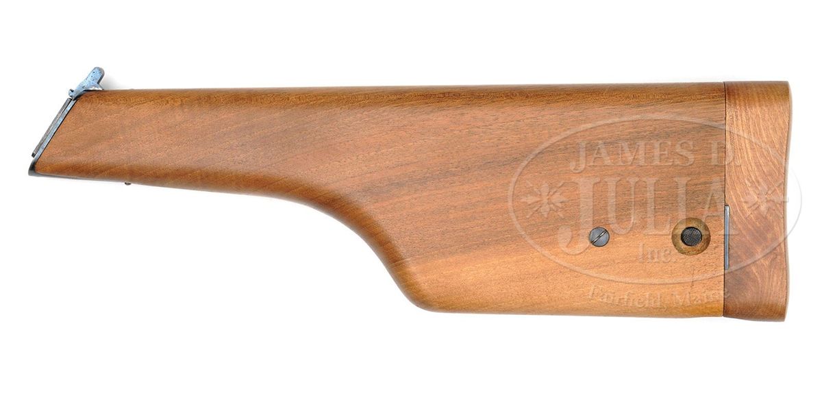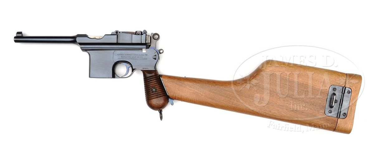 SN 26421. Caliber 7.63mm. Late production Astra M900 with 5.5" bbl, slip-in 50-1000 rear sight, large ring hammer and full size broadly serrated walnut grips. The encircled P, reflecting the Spanish automatic pistol proof, is marked on the right side of the bbl, the right side of the bbl extension and the right side of the frame next to the Eibar proof mark and the E year code 1932. The sideplate on the left side has a three line address that includes the patent date, July 12, 1928. Just above the grip is the full serial number. The short extractor, cursor, bolt stop, safety, trigger, and grip screw are fire blued. Removal of the sideplate shows matching numbers that are also stamped on each grip panel. Original lanyard ring. Perfect mirror bore and perfect mechanics. Accompanied by a superb Astra M900 shoulder stock with original rust blued hinge and fire blued lug whose last three digits are 939. A small amount of wood has been removed from inside the lid that has been renumbered 27864. PROVENANCE: Joseph J. Schroeder, Jr. Collection. CONDITION: Fantastic all original bright blue with only a few pin pricks of wear on each side of the forward rail and near the bottom of the forward magazine well. Negligible sharp edge wear on the frontstrap. The only wear on the backstrap is where it would be in contact with the shoulder stock lug. The extractor retains virtually all of its original fire blue. Only minor wear on the cursor, bolt stop, and the face/sides of the trigger. Stock appears original with fading of the upper arm of the stock lug that is otherwise unmodified. A beautiful Astra M900 rig that, despite the mismatched stock, should please the most discerning collector. 4-48509 LMA26