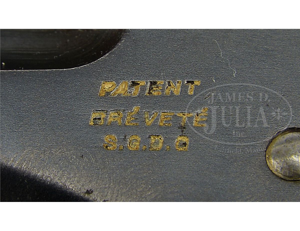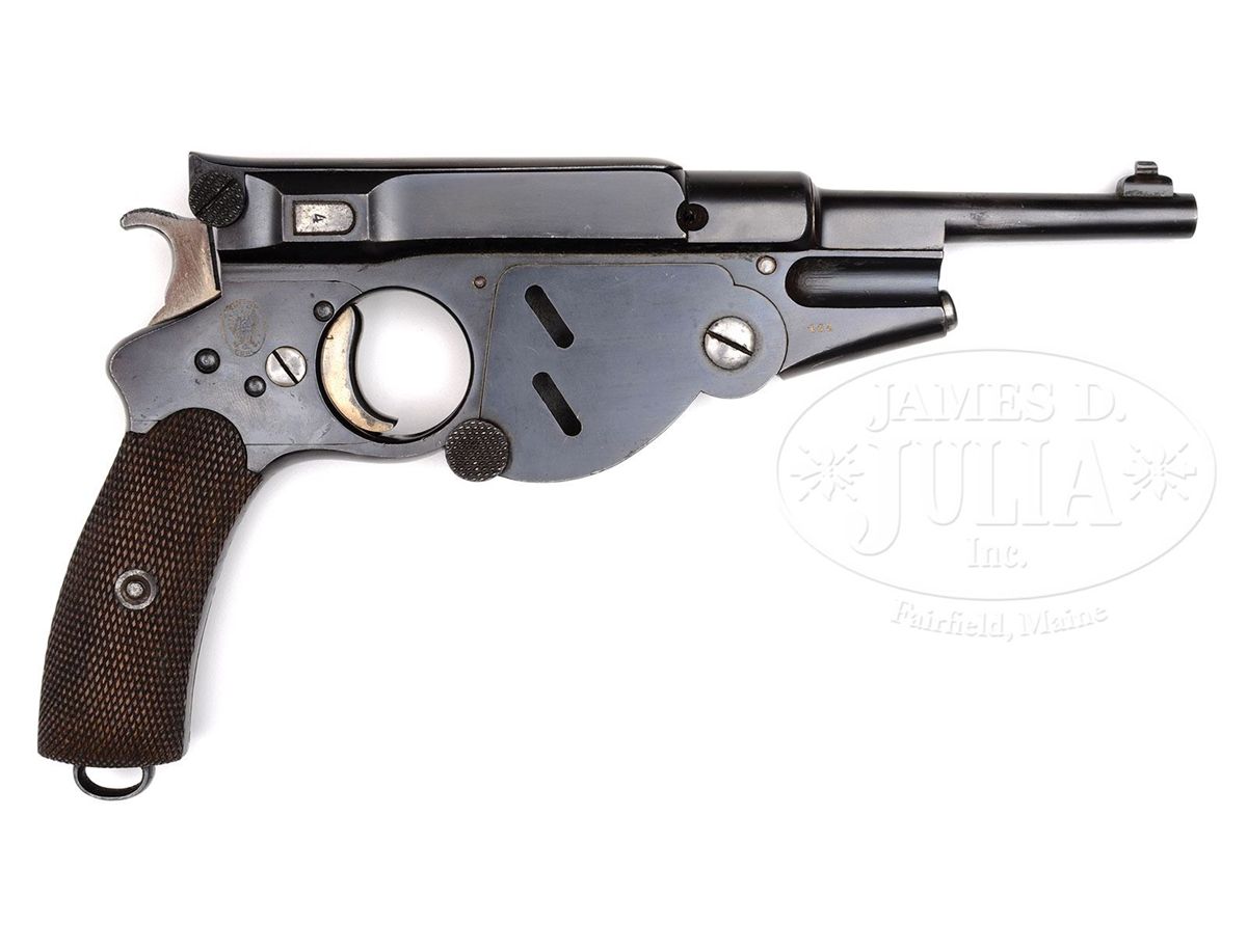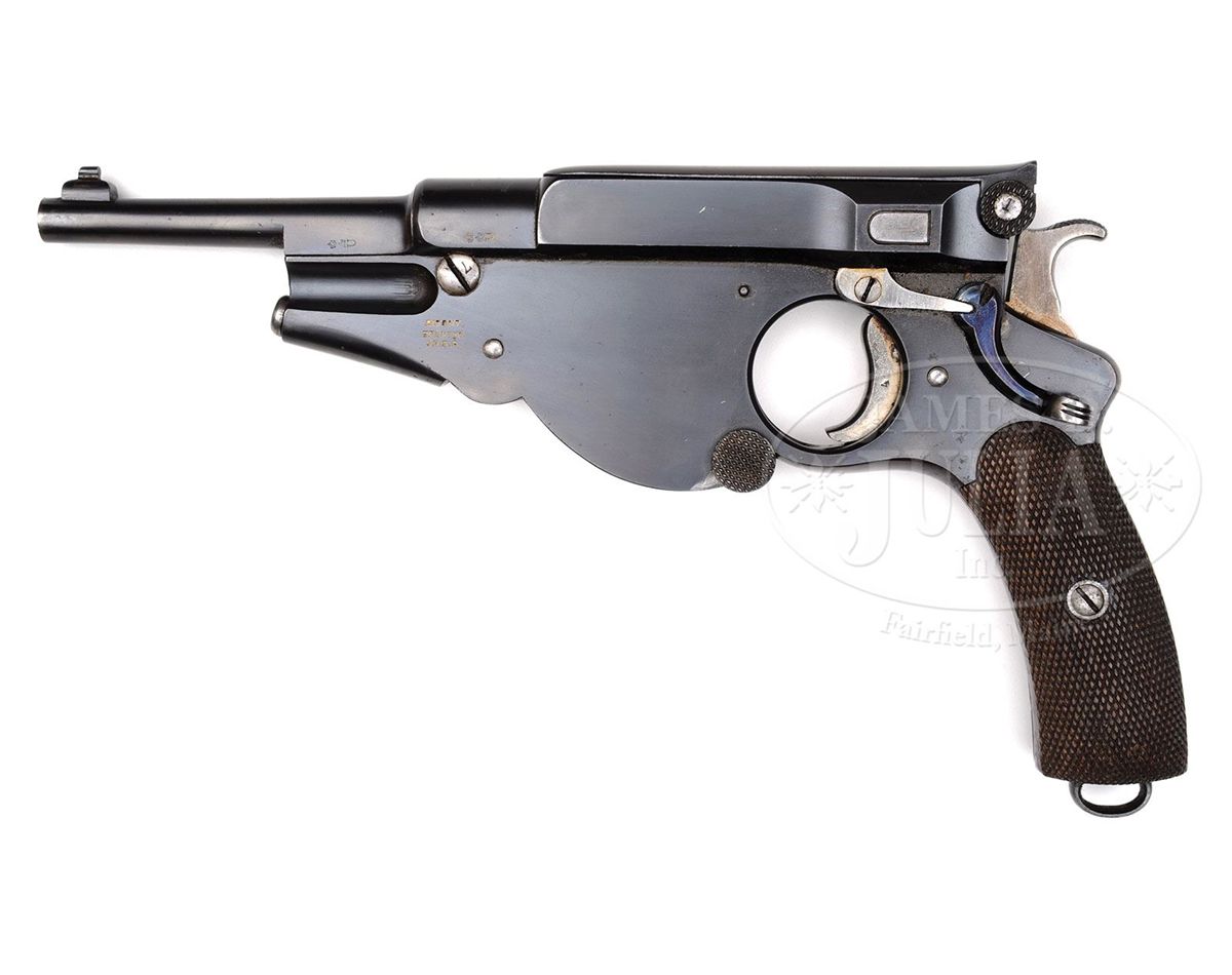 SN 104. Caliber 6.5mm Bergmann. This is an early example of a M1896 #3 semiautomatic pistol as produced by the Bergmann company without extractor and having a narrow grip. Chambered for the 6.5mm Bergmann grooveless rimless cartridge. Theodor Bergman was an early pioneer in the development of European semiautomatic pistols in the late 1890s and early 1900s. His early models were of distinctive design and had a silhouette that would never be confused with a competitor. All of the Number 2s, 3s, and 4s, had an integral magazine that was loaded by rotating down the magazine sideplate and inserting a strip of cartridges from the side. This particular pistol has a 4.5" bbl, a dovetailed front sight and a fixed rear sight integral to the bolt that is afixed to a sliding cover over the ejection port. The unnumbered screw-in bbl is Crown U proofed on the left side, a marking that is repeated on the left side of the chamber. The left receiver, with long flutes is marked "Patent Brevete S.G.D.G.". The serial number 104 appears on the right side of the receiver, just below the flute. In the center of the sideplate is the Bergmann factory logo featuring a miner surmounted by the words "Gaggenau" and over V.C.S. Suhl. In this case, V.C.S. were the initials for V. Charles Schilling, who made the pistols for Bergmann and Suhl, which was the location. Walnut grips are finely checkered without a border and without a logo. PROVENANCE: Joseph J. Schroeder, Jr. Collection. CONDITION: Original finish, estimated at 97%, with minimal wear on the right side of the bbl, and thinned front and backstraps. The straw that was originally used to finish the hammer, safety retainer, and the trigger is also spectacularly nice. Similar considerations apply to the fire blue on the safety lever. Sharply checkered grips without losses or cracks. Bright bore with sharp rifling whose appearance is in keeping with the rest of the gun. Mechanically perfect. 4-48517 LMA55