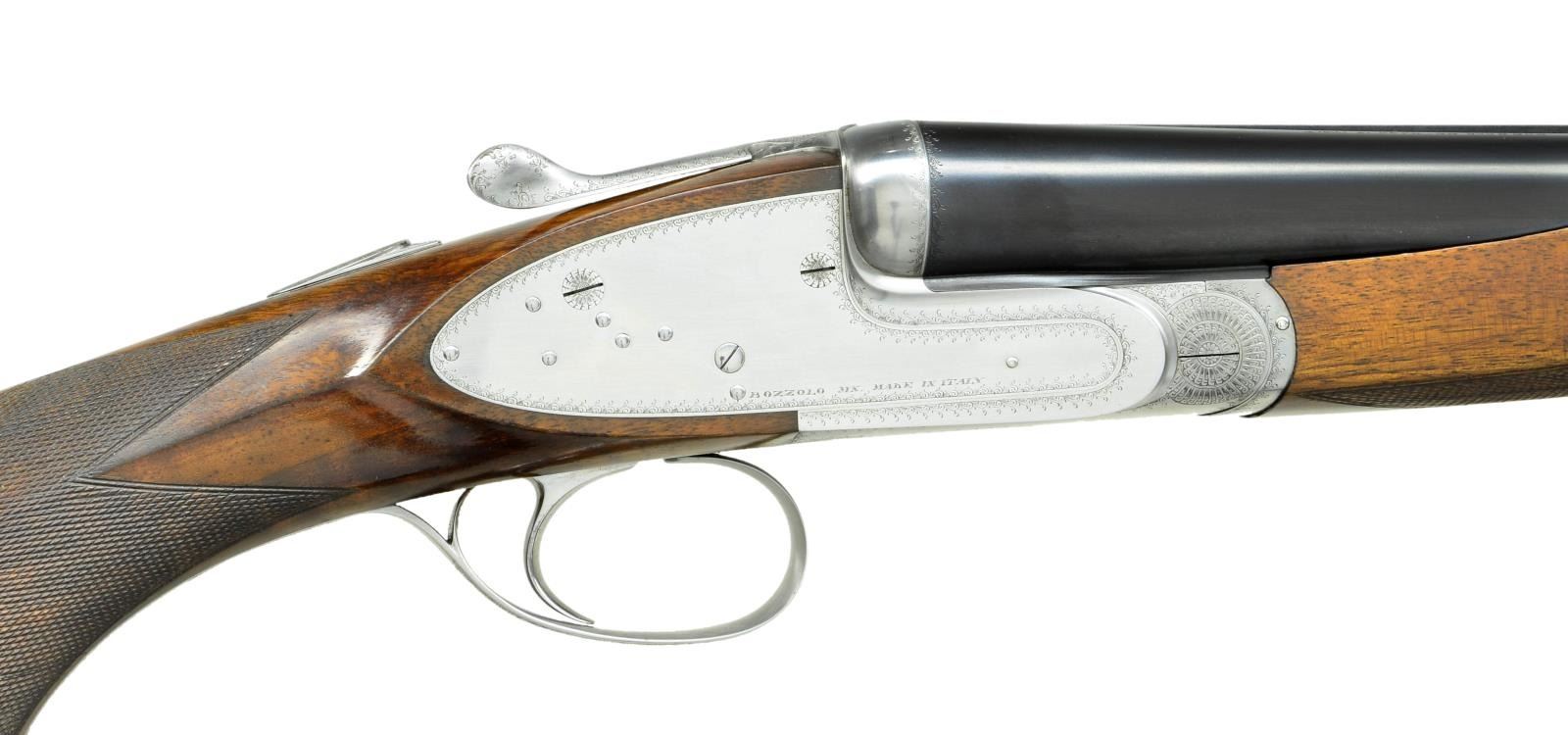 SIDELOCK EJECTOR SINGLE TRIGGER GAME GUN BY GIANFRANCO SORDIGLIONI, SERIAL NUMBER 04. Cal. 12 ga. 2 3/4" S# 04. The 27 5/8" chopperlump bbls. are very finely struck and finished and have slightly raised flat matted rib. Maker's name and address (Bozzolo, Mantua) are engraved on tops. Bbl. flats are stamped with 1979 Italian Nitro proofs for 2 3/4" chambers, serial number and maker's name and address. Bottoms of bbls. are stamped with choke information and engraved "SPECIAL STEEL". Coin finished sidelock action features non-automatic safety ("SEGURA" engraved), bushed strikers, engraved tumbler end cocking indicators and single nonselective mechanical trigger. Action is exceptionally well filed and has light border engraving of very well cut small scroll. Maker's name is on left lockplate and address along with "MADE IN ITALY" is on right. Matching trigger guard is gold inlaid with monogram "DAF". No engraver's signature is found. Pistolgrip buttstock of very nicely fiddle figured and lightly streaked European walnut measures 14 1/2" over thin brown leather covered pad. Closely spaced point pattern checkering is on semi diamond grip. Matching small beavertail ejector forend has Anson release. MEASUREMENTS: BBLS: Bore Diameter: R .726", L .725". Restriction: R .017" (MOD), L .036" (FULL). Min. Wall Thickness: R .030", L .030". STOCK: DAH: 2 1/8". DAC: 1 7/16". LOP: 14 1/2". CAST: approx. 3/8" off. WEIGHT: 7 lb. 9 oz. UNATTACHED ACCESSORIES: gun comes with a high quality brown leather Italian case with stitched leather corners which is lined in scarlet velvet. CONDITION: exceptionally fine, appears to have been fired very little and remains close to new. There are only one or two of the faintest minor marks and evidence of handling in all metal finishes and only a scattered few light marks in wood, most notably some small scratches on right side of forend. Bores are bright and shiny. Mechanically crisp. Case shows some rubs on its exterior leather. Interior has a few minor stains and some rubs. Fine gunmaking is evident in all metal work of this elegant gun. (22-5224/MGM). CURIO. $7,000-11,000.