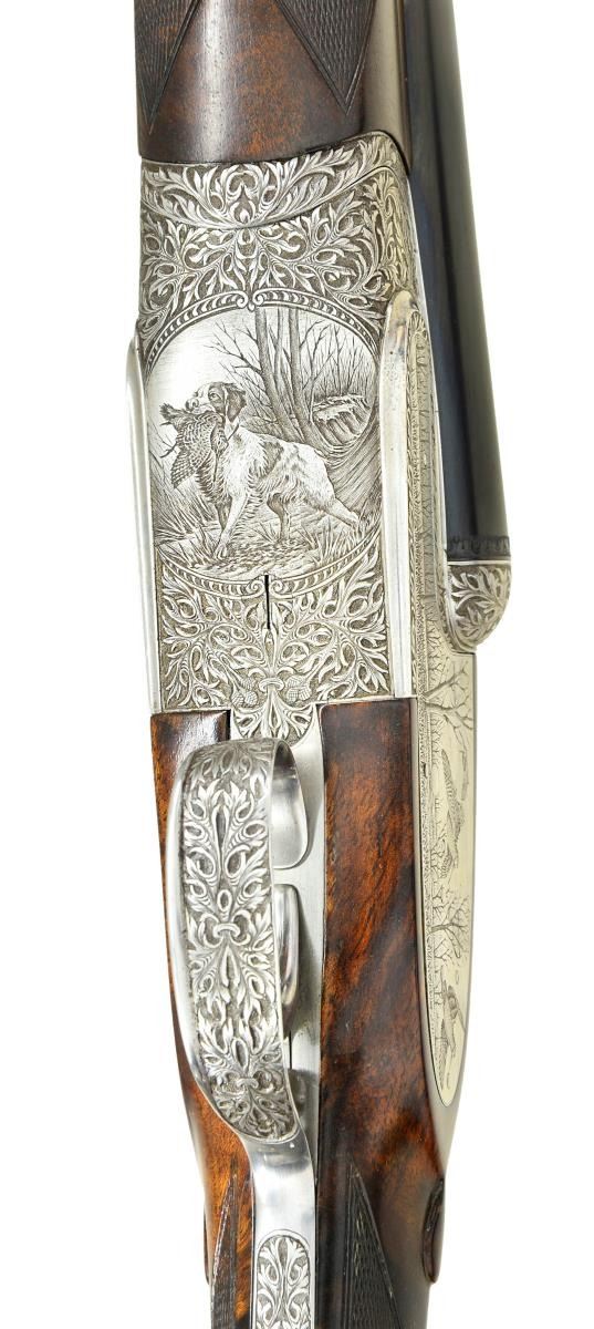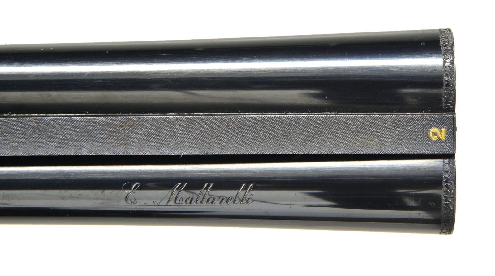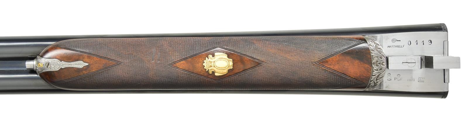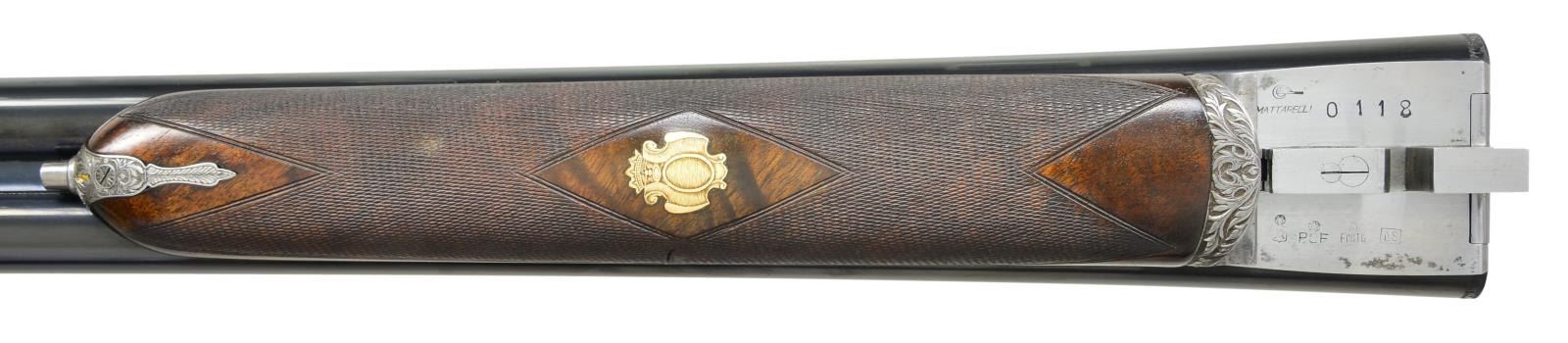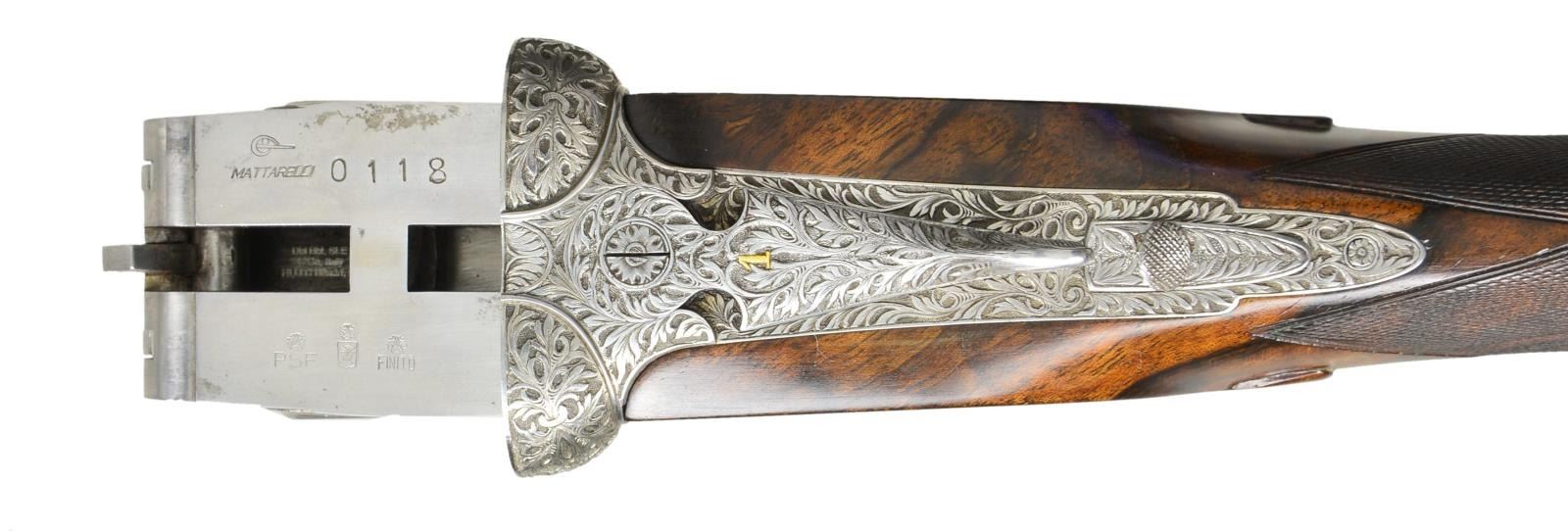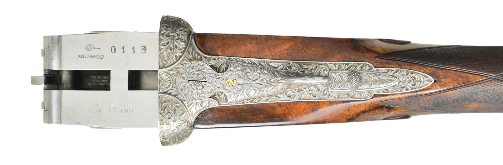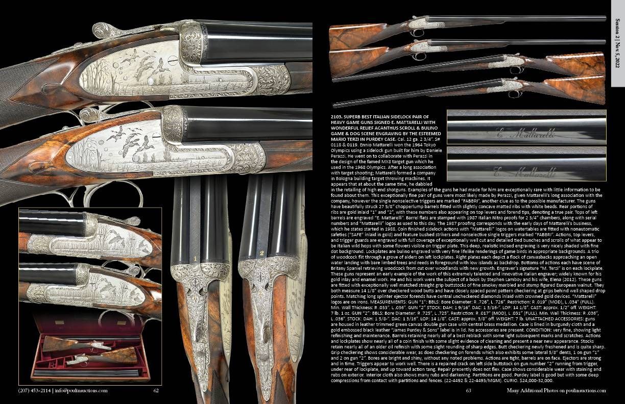 GUNS SIGNED E. MATTARELLI WITH WONDERFUL RELIEF ACANTHUS SCROLL & BULINO GAME & DOG SCENE ENGRAVING BY THE ESTEEMED MARIO TERZI IN PURDEY CASE. Cal. 12 ga. 2 3/4". S# 0118 & 0119. Ennio Mattarelli won the 1964 Tokyo Olympics using a sidelock gun built for him by Daniele Perazzi. He went on to collaborate with Perazzi in the design of the famed MX8 target gun which he used in the 1968 Olympics. After a long association with target shooting; Mattarelli formed a company in Bologna building target throwing machines. It appears that at about the same time, he dabbled in the retailing of high end shotguns. Examples of the guns he had made for him are exceptionally rare with little information to be found about them. This exceptionally fine pair of guns were most likely made by Perazzi, given Mattarelli's long association with the company, however the single nonselective triggers are marked "FABBRI", another clue as to the possible manufacturer. The guns have beautifully struck 27 5/8" chopperlump barrels fitted with slightly concave matted ribs with white beads. Rear portions of ribs are gold inlaid "1" and "2", with these numbers also appearing on top levers and forend tips, denoting a true pair. Tops of left barrels are engraved "E. Mattarelli". Barrel flats are stamped with 1987 Italian Nitro proofs for 2 3/4" chambers, along with serial numbers and "Mattarelli" logos as used to this day. The 1987 proofing corresponds with the early days of Mattarelli's business, which he states started in 1988. Coin finished sidelock actions with "Mattarelli" logos on watertables are fitted with nonautomatic safeties ("SAFE" inlaid in gold) and feature bushed strikers and nonselective single triggers marked "FABBRI". Actions, top levers, and trigger guards are engraved with full coverage of exceptionally well cut and detailed tied bunches and scrolls of what appear to be Italian wild hops with some flowers visible on trigger plate. This deep, realistic incised engraving is very nicely shaded with fine dot background. Lockplates are bulino engraved with very fine lifelike renderings of game birds in appropriate backgrounds. A trio of woodcock flit through a grove of alders on left lockplates. Right plates each depict a flock of canvasbacks approaching an open water landing with bare limbed trees and reeds in foreground with low islands as backdrop. Bottoms of actions each have scene of Britany Spaniel retrieving woodcock from cut over woodlands with new growth. Engraver's signature "M. Terzi" is on each lockplate. These guns represent an early example of the work of this extremely talented and innovative Italian engraver; widely known for his gold inlay and enamel work. He and his work were the subject of a book by Stephen Lamboy and his wife, Elena (2012). These guns are fitted with exceptionally well matched straight grip buttstocks of fine smokey marbled and stump figured European walnut. They both measure 14 1/8" over checkered wood butts and have closely spaced point pattern checkering at grips behind well shaped drop points. Matching long splinter ejector forends have central uncheckered diamonds inlaid with crowned gold devices. "Mattarelli" logos are on irons. MEASUREMENTS: GUN "1": BBLS: Bore Diameter: R .726", L .726". Restriction: R .019" (MOD), L .034" (FULL). Min. Wall Thickness: R .033". L .036". GUN "2" STOCK: DAH: 1 9/16". DAC: 1 3/16-". LOP: 14 1/8". CAST: approx. 1/2" off. WEIGHT: 7 lb. 1 oz. GUN "2": BBLS: Bore Diameter: R .725", L .725". Restriction: R .017" (MOD), L .031" (FULL). Min. Wall Thickness: R .036", L .036". STOCK: DAH: 1 5/8-". DAC: 1 3/16". LOP: 14 1/8". CAST: approx. 3/8" off. WEIGHT: 7 lb. UNATTACHED ACCESSORIES: guns are housed in leather trimmed green canvas double gun case with central brass medallion. Case is lined in burgundy cloth and a gold embossed black leather "James Purdey & Sons" label is in lid. No accessories are present. CONDITION: very fine, showing light refinishing and maintenance. Barrels retaining nearly all of a best reblack with some light subsequent marks and scratches. Actions and lockplates show nearly all of a coin finish with some slight evidence of cleaning and present a near new appearance. Stocks retain nearly all of an older oil refinish with some slight rounding of sharp edges. Butt checkering newly freshened and is quite sharp. Grip checkering shows considerable wear, as does checkering on forends which also exhibits some lateral 5/8" dents, 1 on gun "1" and 2 on gun "2". Bores are bright and shiny, without any noted problems. Actions are tight, barrels are on face. Ejectors are strong and in time. Triggers appear to work well. There is a repaired crack on left side buttstock on gun number "2" running from trigger, under rear of lockplate, and up toward action tang. Repair presently does not flex. Case shows considerable wear with staining and rubs on exterior. Interior cloth also shows many rubs and darkening. Partitions are good. Purdey label is good but with some deep compressions from contact with partitions and fences. (22-4492 & 22-4493/MGM). CURIO. $24,000-32,000.