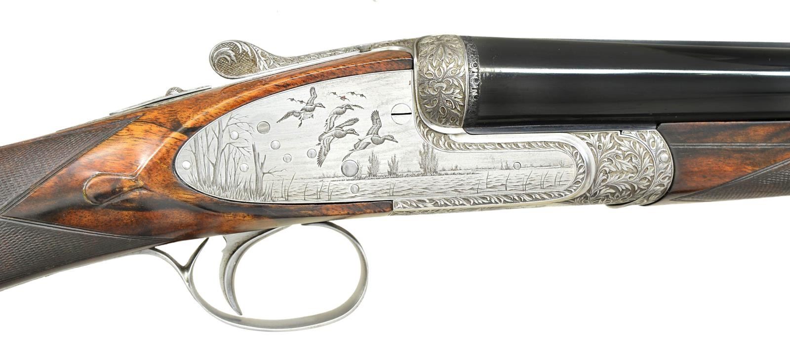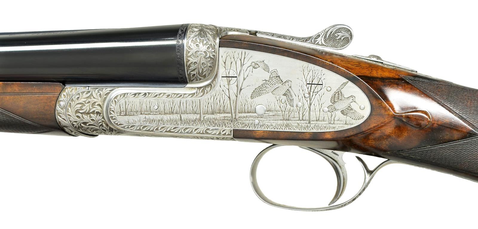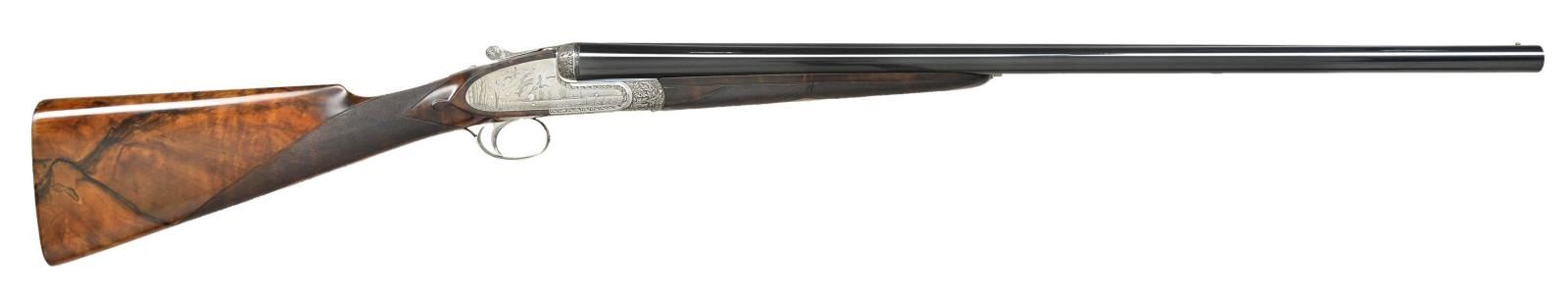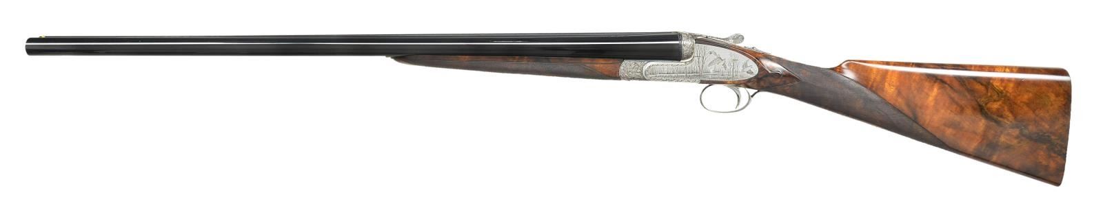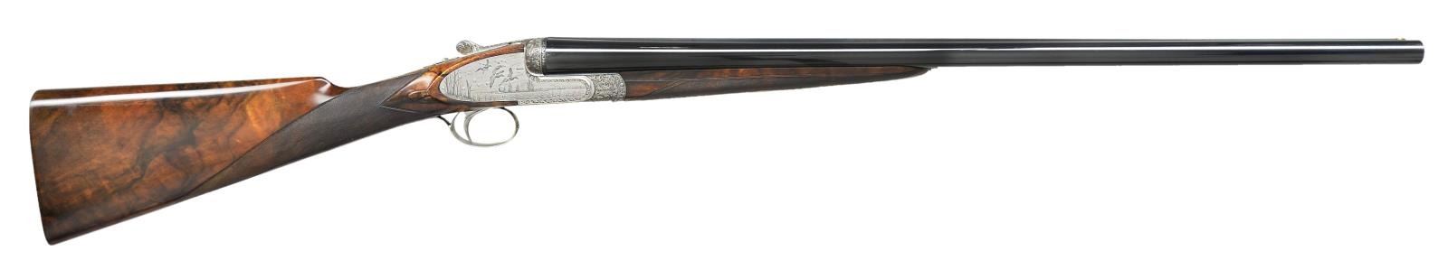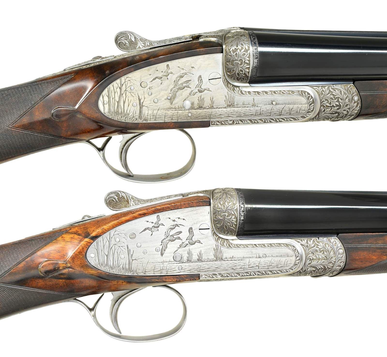 GUNS SIGNED E. MATTARELLI WITH WONDERFUL RELIEF ACANTHUS SCROLL & BULINO GAME & DOG SCENE ENGRAVING BY THE ESTEEMED MARIO TERZI IN PURDEY CASE. Cal. 12 ga. 2 3/4". S# 0118 & 0119. Ennio Mattarelli won the 1964 Tokyo Olympics using a sidelock gun built for him by Daniele Perazzi. He went on to collaborate with Perazzi in the design of the famed MX8 target gun which he used in the 1968 Olympics. After a long association with target shooting; Mattarelli formed a company in Bologna building target throwing machines. It appears that at about the same time, he dabbled in the retailing of high end shotguns. Examples of the guns he had made for him are exceptionally rare with little information to be found about them. This exceptionally fine pair of guns were most likely made by Perazzi, given Mattarelli's long association with the company, however the single nonselective triggers are marked "FABBRI", another clue as to the possible manufacturer. The guns have beautifully struck 27 5/8" chopperlump barrels fitted with slightly concave matted ribs with white beads. Rear portions of ribs are gold inlaid "1" and "2", with these numbers also appearing on top levers and forend tips, denoting a true pair. Tops of left barrels are engraved "E. Mattarelli". Barrel flats are stamped with 1987 Italian Nitro proofs for 2 3/4" chambers, along with serial numbers and "Mattarelli" logos as used to this day. The 1987 proofing corresponds with the early days of Mattarelli's business, which he states started in 1988. Coin finished sidelock actions with "Mattarelli" logos on watertables are fitted with nonautomatic safeties ("SAFE" inlaid in gold) and feature bushed strikers and nonselective single triggers marked "FABBRI". Actions, top levers, and trigger guards are engraved with full coverage of exceptionally well cut and detailed tied bunches and scrolls of what appear to be Italian wild hops with some flowers visible on trigger plate. This deep, realistic incised engraving is very nicely shaded with fine dot background. Lockplates are bulino engraved with very fine lifelike renderings of game birds in appropriate backgrounds. A trio of woodcock flit through a grove of alders on left lockplates. Right plates each depict a flock of canvasbacks approaching an open water landing with bare limbed trees and reeds in foreground with low islands as backdrop. Bottoms of actions each have scene of Britany Spaniel retrieving woodcock from cut over woodlands with new growth. Engraver's signature "M. Terzi" is on each lockplate. These guns represent an early example of the work of this extremely talented and innovative Italian engraver; widely known for his gold inlay and enamel work. He and his work were the subject of a book by Stephen Lamboy and his wife, Elena (2012). These guns are fitted with exceptionally well matched straight grip buttstocks of fine smokey marbled and stump figured European walnut. They both measure 14 1/8" over checkered wood butts and have closely spaced point pattern checkering at grips behind well shaped drop points. Matching long splinter ejector forends have central uncheckered diamonds inlaid with crowned gold devices. "Mattarelli" logos are on irons. MEASUREMENTS: GUN "1": BBLS: Bore Diameter: R .726", L .726". Restriction: R .019" (MOD), L .034" (FULL). Min. Wall Thickness: R .033". L .036". GUN "2" STOCK: DAH: 1 9/16". DAC: 1 3/16-". LOP: 14 1/8". CAST: approx. 1/2" off. WEIGHT: 7 lb. 1 oz. GUN "2": BBLS: Bore Diameter: R .725", L .725". Restriction: R .017" (MOD), L .031" (FULL). Min. Wall Thickness: R .036", L .036". STOCK: DAH: 1 5/8-". DAC: 1 3/16". LOP: 14 1/8". CAST: approx. 3/8" off. WEIGHT: 7 lb. UNATTACHED ACCESSORIES: guns are housed in leather trimmed green canvas double gun case with central brass medallion. Case is lined in burgundy cloth and a gold embossed black leather "James Purdey & Sons" label is in lid. No accessories are present. CONDITION: very fine, showing light refinishing and maintenance. Barrels retaining nearly all of a best reblack with some light subsequent marks and scratches. Actions and lockplates show nearly all of a coin finish with some slight evidence of cleaning and present a near new appearance. Stocks retain nearly all of an older oil refinish with some slight rounding of sharp edges. Butt checkering newly freshened and is quite sharp. Grip checkering shows considerable wear, as does checkering on forends which also exhibits some lateral 5/8" dents, 1 on gun "1" and 2 on gun "2". Bores are bright and shiny, without any noted problems. Actions are tight, barrels are on face. Ejectors are strong and in time. Triggers appear to work well. There is a repaired crack on left side buttstock on gun number "2" running from trigger, under rear of lockplate, and up toward action tang. Repair presently does not flex. Case shows considerable wear with staining and rubs on exterior. Interior cloth also shows many rubs and darkening. Partitions are good. Purdey label is good but with some deep compressions from contact with partitions and fences. (22-4492 & 22-4493/MGM). CURIO. $24,000-32,000.