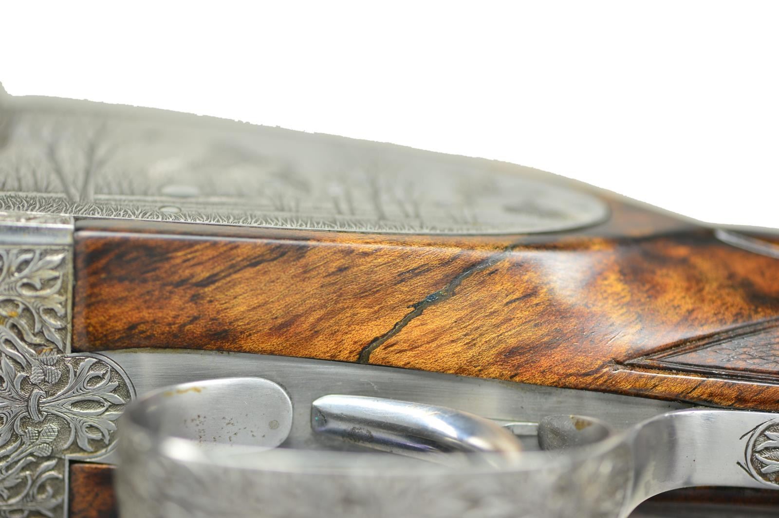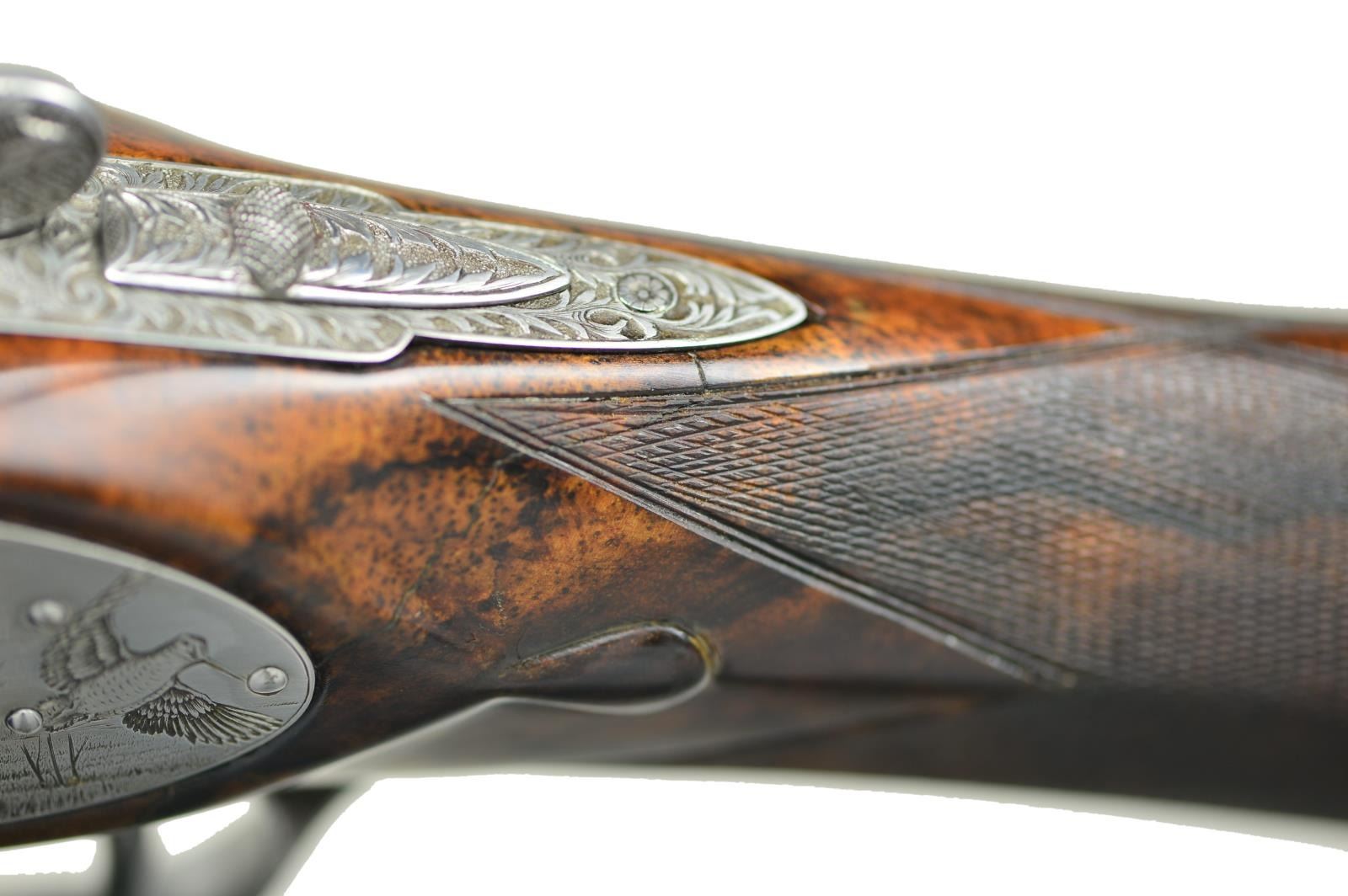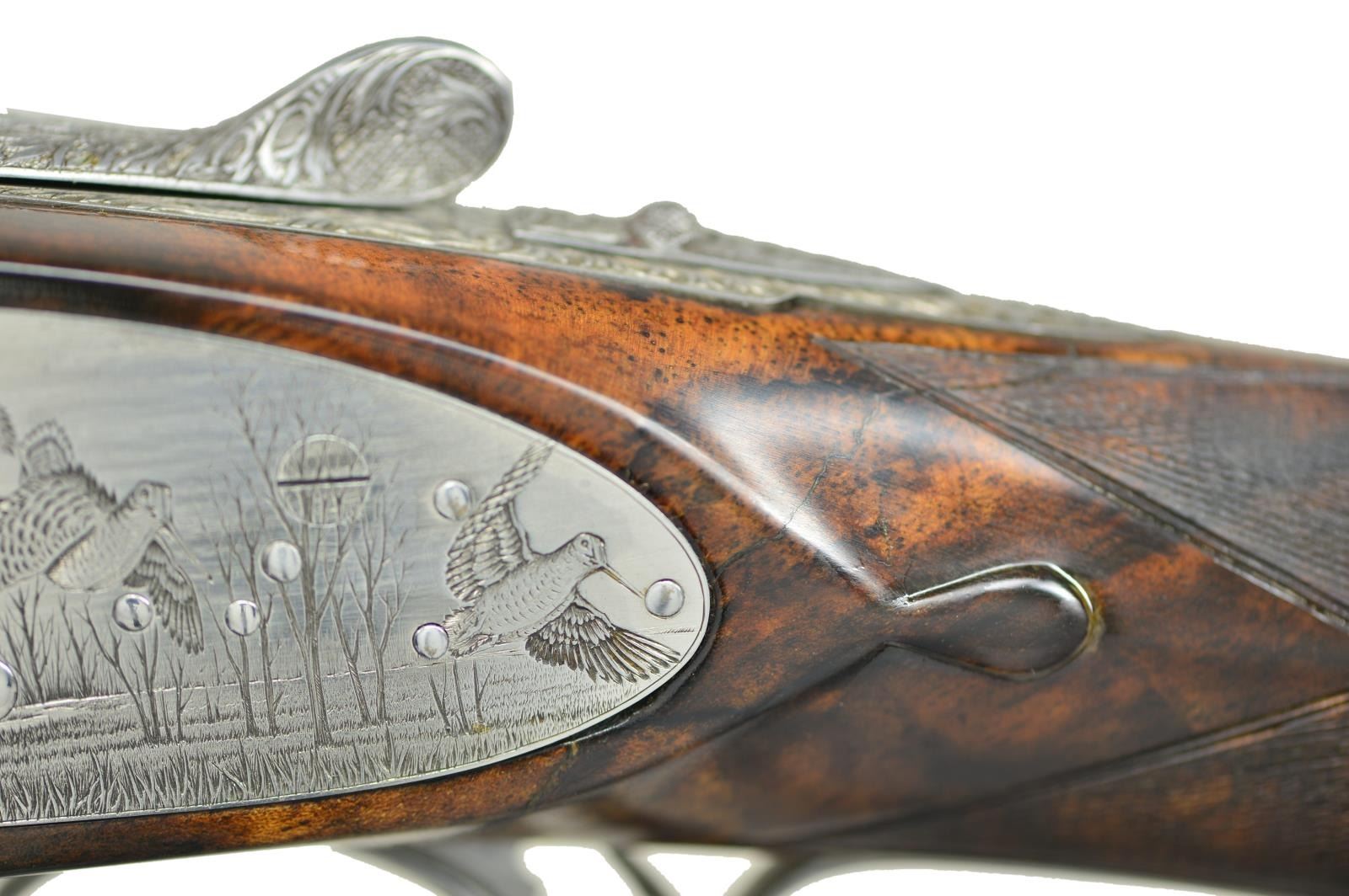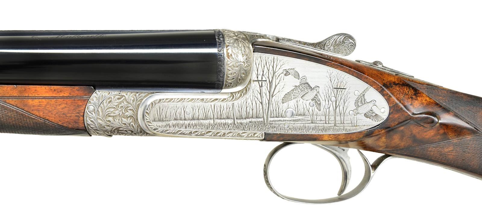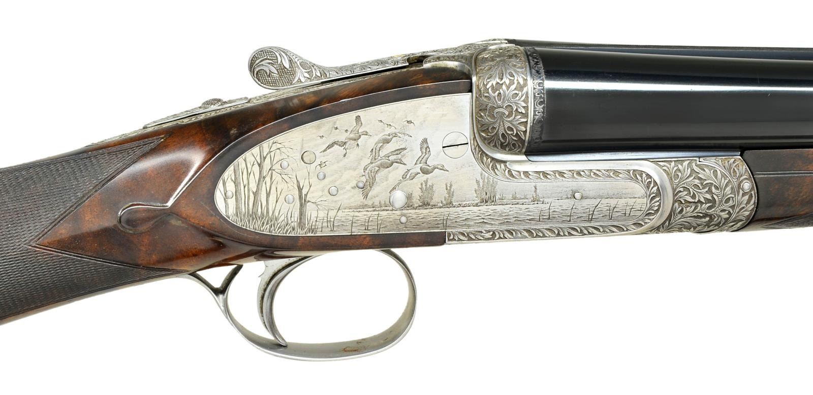 GUNS SIGNED E. MATTARELLI WITH WONDERFUL RELIEF ACANTHUS SCROLL & BULINO GAME & DOG SCENE ENGRAVING BY THE ESTEEMED MARIO TERZI IN PURDEY CASE. Cal. 12 ga. 2 3/4". S# 0118 & 0119. Ennio Mattarelli won the 1964 Tokyo Olympics using a sidelock gun built for him by Daniele Perazzi. He went on to collaborate with Perazzi in the design of the famed MX8 target gun which he used in the 1968 Olympics. After a long association with target shooting; Mattarelli formed a company in Bologna building target throwing machines. It appears that at about the same time, he dabbled in the retailing of high end shotguns. Examples of the guns he had made for him are exceptionally rare with little information to be found about them. This exceptionally fine pair of guns were most likely made by Perazzi, given Mattarelli's long association with the company, however the single nonselective triggers are marked "FABBRI", another clue as to the possible manufacturer. The guns have beautifully struck 27 5/8" chopperlump barrels fitted with slightly concave matted ribs with white beads. Rear portions of ribs are gold inlaid "1" and "2", with these numbers also appearing on top levers and forend tips, denoting a true pair. Tops of left barrels are engraved "E. Mattarelli". Barrel flats are stamped with 1987 Italian Nitro proofs for 2 3/4" chambers, along with serial numbers and "Mattarelli" logos as used to this day. The 1987 proofing corresponds with the early days of Mattarelli's business, which he states started in 1988. Coin finished sidelock actions with "Mattarelli" logos on watertables are fitted with nonautomatic safeties ("SAFE" inlaid in gold) and feature bushed strikers and nonselective single triggers marked "FABBRI". Actions, top levers, and trigger guards are engraved with full coverage of exceptionally well cut and detailed tied bunches and scrolls of what appear to be Italian wild hops with some flowers visible on trigger plate. This deep, realistic incised engraving is very nicely shaded with fine dot background. Lockplates are bulino engraved with very fine lifelike renderings of game birds in appropriate backgrounds. A trio of woodcock flit through a grove of alders on left lockplates. Right plates each depict a flock of canvasbacks approaching an open water landing with bare limbed trees and reeds in foreground with low islands as backdrop. Bottoms of actions each have scene of Britany Spaniel retrieving woodcock from cut over woodlands with new growth. Engraver's signature "M. Terzi" is on each lockplate. These guns represent an early example of the work of this extremely talented and innovative Italian engraver; widely known for his gold inlay and enamel work. He and his work were the subject of a book by Stephen Lamboy and his wife, Elena (2012). These guns are fitted with exceptionally well matched straight grip buttstocks of fine smokey marbled and stump figured European walnut. They both measure 14 1/8" over checkered wood butts and have closely spaced point pattern checkering at grips behind well shaped drop points. Matching long splinter ejector forends have central uncheckered diamonds inlaid with crowned gold devices. "Mattarelli" logos are on irons. MEASUREMENTS: GUN "1": BBLS: Bore Diameter: R .726", L .726". Restriction: R .019" (MOD), L .034" (FULL). Min. Wall Thickness: R .033". L .036". GUN "2" STOCK: DAH: 1 9/16". DAC: 1 3/16-". LOP: 14 1/8". CAST: approx. 1/2" off. WEIGHT: 7 lb. 1 oz. GUN "2": BBLS: Bore Diameter: R .725", L .725". Restriction: R .017" (MOD), L .031" (FULL). Min. Wall Thickness: R .036", L .036". STOCK: DAH: 1 5/8-". DAC: 1 3/16". LOP: 14 1/8". CAST: approx. 3/8" off. WEIGHT: 7 lb. UNATTACHED ACCESSORIES: guns are housed in leather trimmed green canvas double gun case with central brass medallion. Case is lined in burgundy cloth and a gold embossed black leather "James Purdey & Sons" label is in lid. No accessories are present. CONDITION: very fine, showing light refinishing and maintenance. Barrels retaining nearly all of a best reblack with some light subsequent marks and scratches. Actions and lockplates show nearly all of a coin finish with some slight evidence of cleaning and present a near new appearance. Stocks retain nearly all of an older oil refinish with some slight rounding of sharp edges. Butt checkering newly freshened and is quite sharp. Grip checkering shows considerable wear, as does checkering on forends which also exhibits some lateral 5/8" dents, 1 on gun "1" and 2 on gun "2". Bores are bright and shiny, without any noted problems. Actions are tight, barrels are on face. Ejectors are strong and in time. Triggers appear to work well. There is a repaired crack on left side buttstock on gun number "2" running from trigger, under rear of lockplate, and up toward action tang. Repair presently does not flex. Case shows considerable wear with staining and rubs on exterior. Interior cloth also shows many rubs and darkening. Partitions are good. Purdey label is good but with some deep compressions from contact with partitions and fences. (22-4492 & 22-4493/MGM). CURIO. $24,000-32,000.