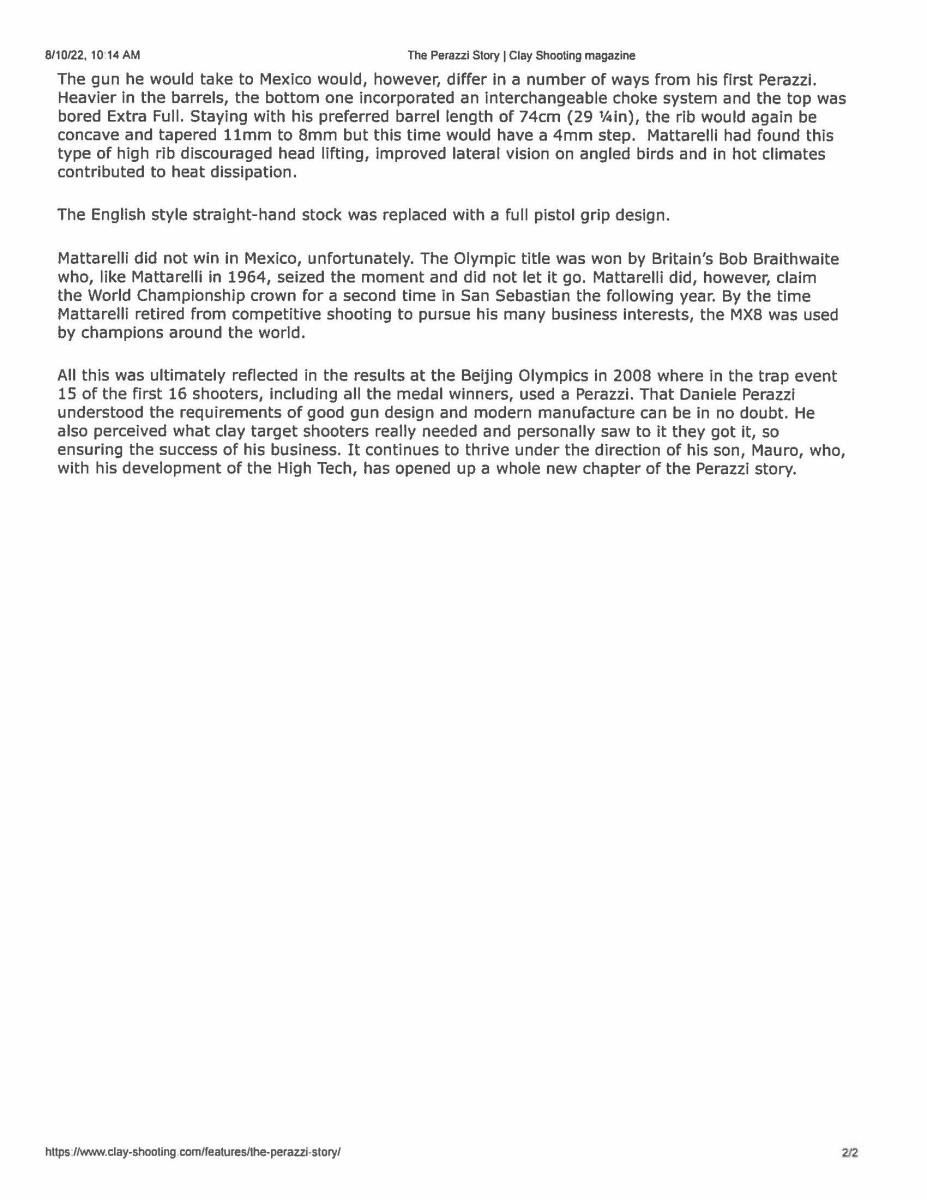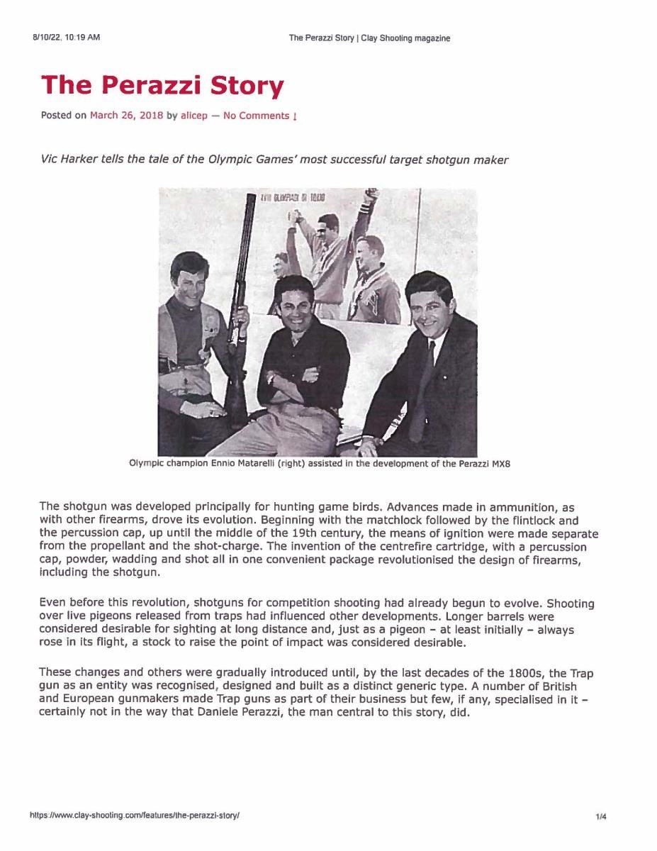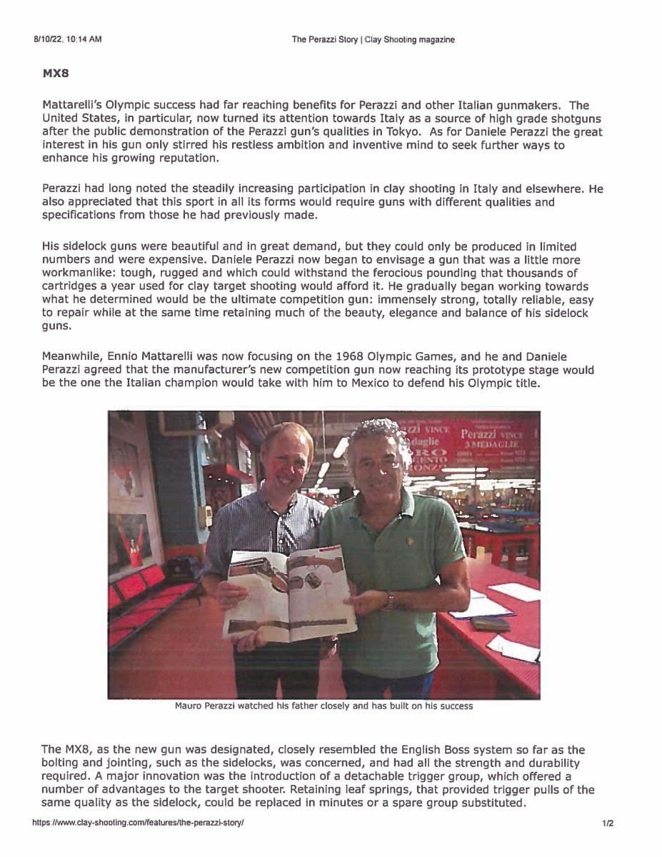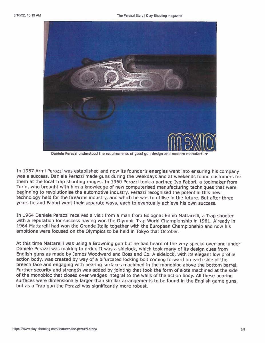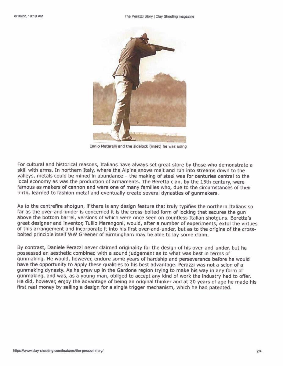 GUNS SIGNED E. MATTARELLI WITH WONDERFUL RELIEF ACANTHUS SCROLL & BULINO GAME & DOG SCENE ENGRAVING BY THE ESTEEMED MARIO TERZI IN PURDEY CASE. Cal. 12 ga. 2 3/4". S# 0118 & 0119. Ennio Mattarelli won the 1964 Tokyo Olympics using a sidelock gun built for him by Daniele Perazzi. He went on to collaborate with Perazzi in the design of the famed MX8 target gun which he used in the 1968 Olympics. After a long association with target shooting; Mattarelli formed a company in Bologna building target throwing machines. It appears that at about the same time, he dabbled in the retailing of high end shotguns. Examples of the guns he had made for him are exceptionally rare with little information to be found about them. This exceptionally fine pair of guns were most likely made by Perazzi, given Mattarelli's long association with the company, however the single nonselective triggers are marked "FABBRI", another clue as to the possible manufacturer. The guns have beautifully struck 27 5/8" chopperlump barrels fitted with slightly concave matted ribs with white beads. Rear portions of ribs are gold inlaid "1" and "2", with these numbers also appearing on top levers and forend tips, denoting a true pair. Tops of left barrels are engraved "E. Mattarelli". Barrel flats are stamped with 1987 Italian Nitro proofs for 2 3/4" chambers, along with serial numbers and "Mattarelli" logos as used to this day. The 1987 proofing corresponds with the early days of Mattarelli's business, which he states started in 1988. Coin finished sidelock actions with "Mattarelli" logos on watertables are fitted with nonautomatic safeties ("SAFE" inlaid in gold) and feature bushed strikers and nonselective single triggers marked "FABBRI". Actions, top levers, and trigger guards are engraved with full coverage of exceptionally well cut and detailed tied bunches and scrolls of what appear to be Italian wild hops with some flowers visible on trigger plate. This deep, realistic incised engraving is very nicely shaded with fine dot background. Lockplates are bulino engraved with very fine lifelike renderings of game birds in appropriate backgrounds. A trio of woodcock flit through a grove of alders on left lockplates. Right plates each depict a flock of canvasbacks approaching an open water landing with bare limbed trees and reeds in foreground with low islands as backdrop. Bottoms of actions each have scene of Britany Spaniel retrieving woodcock from cut over woodlands with new growth. Engraver's signature "M. Terzi" is on each lockplate. These guns represent an early example of the work of this extremely talented and innovative Italian engraver; widely known for his gold inlay and enamel work. He and his work were the subject of a book by Stephen Lamboy and his wife, Elena (2012). These guns are fitted with exceptionally well matched straight grip buttstocks of fine smokey marbled and stump figured European walnut. They both measure 14 1/8" over checkered wood butts and have closely spaced point pattern checkering at grips behind well shaped drop points. Matching long splinter ejector forends have central uncheckered diamonds inlaid with crowned gold devices. "Mattarelli" logos are on irons. MEASUREMENTS: GUN "1": BBLS: Bore Diameter: R .726", L .726". Restriction: R .019" (MOD), L .034" (FULL). Min. Wall Thickness: R .033". L .036". GUN "2" STOCK: DAH: 1 9/16". DAC: 1 3/16-". LOP: 14 1/8". CAST: approx. 1/2" off. WEIGHT: 7 lb. 1 oz. GUN "2": BBLS: Bore Diameter: R .725", L .725". Restriction: R .017" (MOD), L .031" (FULL). Min. Wall Thickness: R .036", L .036". STOCK: DAH: 1 5/8-". DAC: 1 3/16". LOP: 14 1/8". CAST: approx. 3/8" off. WEIGHT: 7 lb. UNATTACHED ACCESSORIES: guns are housed in leather trimmed green canvas double gun case with central brass medallion. Case is lined in burgundy cloth and a gold embossed black leather "James Purdey & Sons" label is in lid. No accessories are present. CONDITION: very fine, showing light refinishing and maintenance. Barrels retaining nearly all of a best reblack with some light subsequent marks and scratches. Actions and lockplates show nearly all of a coin finish with some slight evidence of cleaning and present a near new appearance. Stocks retain nearly all of an older oil refinish with some slight rounding of sharp edges. Butt checkering newly freshened and is quite sharp. Grip checkering shows considerable wear, as does checkering on forends which also exhibits some lateral 5/8" dents, 1 on gun "1" and 2 on gun "2". Bores are bright and shiny, without any noted problems. Actions are tight, barrels are on face. Ejectors are strong and in time. Triggers appear to work well. There is a repaired crack on left side buttstock on gun number "2" running from trigger, under rear of lockplate, and up toward action tang. Repair presently does not flex. Case shows considerable wear with staining and rubs on exterior. Interior cloth also shows many rubs and darkening. Partitions are good. Purdey label is good but with some deep compressions from contact with partitions and fences. (22-4492 & 22-4493/MGM). CURIO. $24,000-32,000.