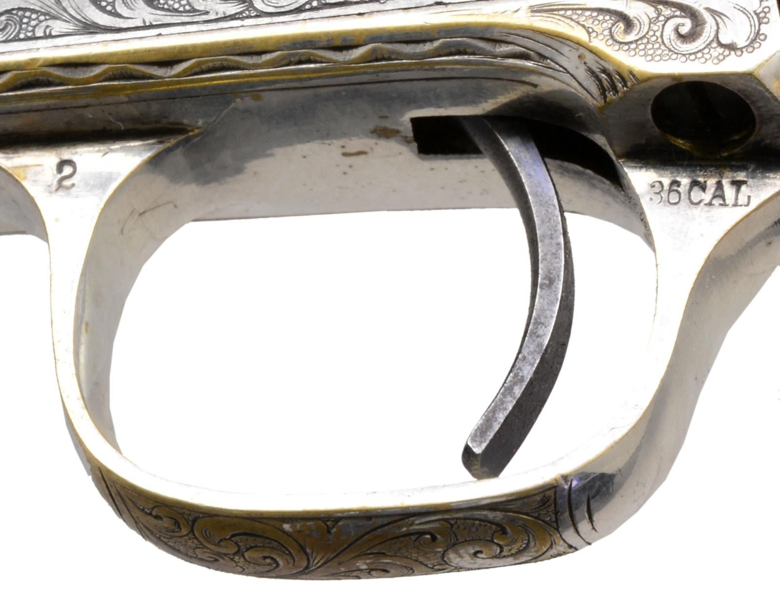 COLT 1862 POLICE REVOLVERS WITH ORIGINAL IVORY GRIPS. BOTH: cal. 36. 1) S# 15889/IE. 2) S# 15891/IE. Bbls. 6 1/2". S#s indicate a mfg. date early in 1863. Both bbls. are marked on the top, "ADDRESS COL SAML COLT NEW-YORK U.S AMERICA". Foliate bbl. engraving extends nearly 3" up from the frames. There is engraving around the muzzles & flourishes on either side. The 5 shot rebated & half fluted cylinders have similar engraving. The frames are covered w/ foliate engraving as are the hammers. Frames are marked below cyl., "COLT'S PATENT". Trigger guards & backstraps are silver plated w/ foliate engraving highlighting most areas. The left sides of the trigger guards are stamped, "36 CAL" to the rear & "2" to the front. The backstraps are engraved, "Amicitea vera est perpetua", which translates to "True friendship is everlasting". All serial numbers on both guns are matching, including the wedges. Trigger guard's S# & butt strap's S# are stamped over "IE", indicating the revolvers were intended to be engraved & receive ivory grips. Original checkered ivory grips are "certifiable antique ivory". UNATTACHED ACCESSORIES: original wooden case measuring 15" x 9" x 2 3/4". Case had a central brass plaque in the lid (now missing). Keyed lock is present & functional but escutcheon plate is missing. Case shows overall light to moderate wear to the finish. Case is lined in purple velvet & houses the 2 pistols, 2 bullet molds, 2 screw driver/nipple wrenches, a pistol powder flask marked "JAMES DIXON & SONS SHEFFIELD" & 2 tins of caps. In addition, there are 2 rectangular interior covered boxes for additional storage. Both bullet molds are marked "COLT'S PATENT" & have nearly complete blued finishes. The screw driver/nipple wrenches also have a nearly complete blued finish. Pistol flask has a brown finish & 1 shallow dent. CONDITION: both revolvers show wear to the blued finish w/ approx. 35% finish remaining. Silver plating is nearly complete w/ some high point wear on the base of the trigger guard & backstrap. Both pistols are mechanically crisp & cycle well. Bores are very fine w/ crisp rifling. Ivory grips have a wonderful rich patina & show light wear. (01-17193/BF). ANTIQUE. $12,000-16,000.