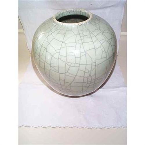 FABULOUS CHINESE LIGHT CELADON COLORED GLOBULAR JAR/BOWL/VASE IN A WIDE CRACKLE GLAZE FINISH. CIRCUMFERENCE IS 28.5", WONDERFUL FORM!  HEAVILY POTTED, UNGLAZED FOOT RIM, SHOWING GREY CLAY. MINOR GLAZE FRACTURES/BUBBLES(mostly around neck rim, see photos) AND SOME BOTTOM ROUGHNESS WHICH EXTENDS UPWARDS ON ONE SIDE OF THE BOTTOM(see photo).  ADDITIONAL HIGHER RESOLUTION PHOTOS AVAILABLE ON REQUEST.A PRIZE PIECE!