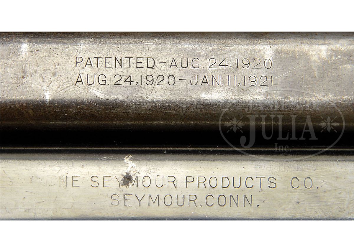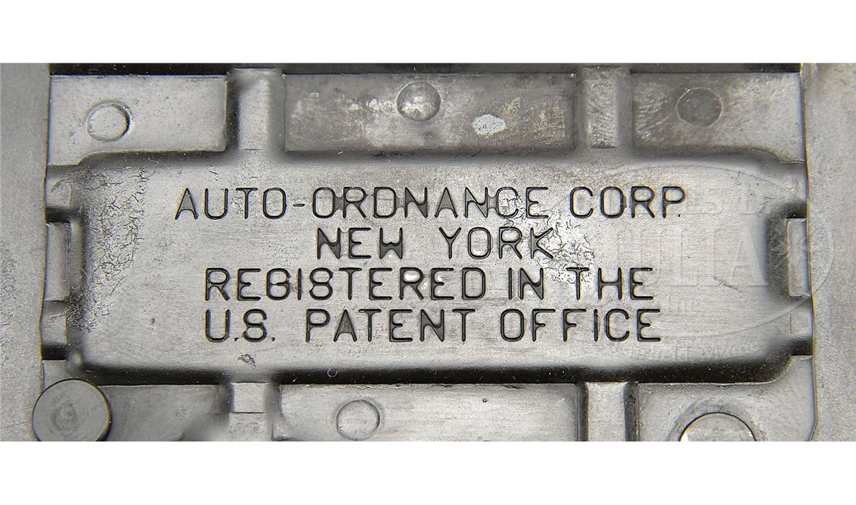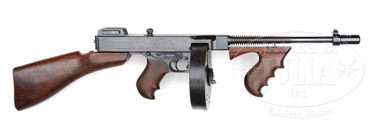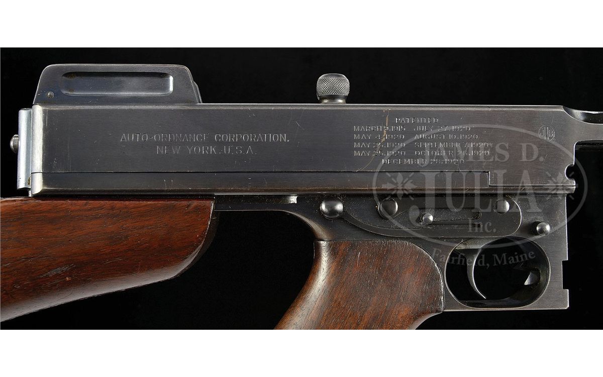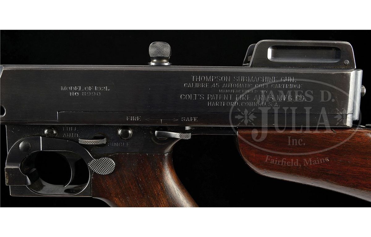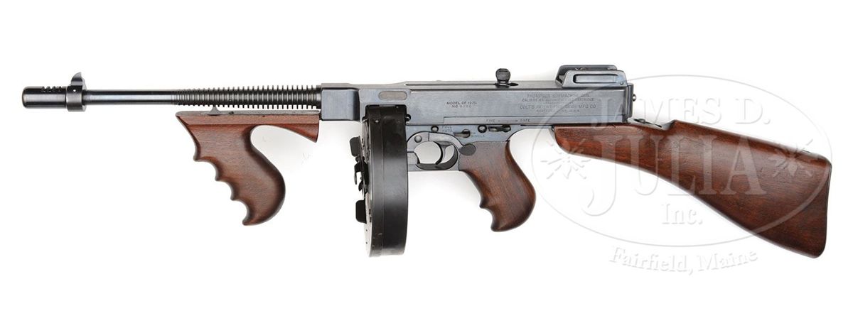 SN 8990. Cal. 45 ACP, 13" bbl. This Colt 1921 Thompson has an unmarked Cutts compensator. Internal parts are 1921. This is an extremely attractive and high condition Colt 1921AC with a vertical forend which includes 1 orig 20 rnd magazine with August 24, 1920 patent date and also one 50 rnd drum marked "AUTO-ORDNANCE CORP NEW YORK REGISTERED IN THE U.S. PATENT OFFICE". Also included are one 30 rnd magazine & an orig brass cleaning rod. The 30 rnd magazine was made by Seymour. Oiler is within buttstock. The firing mechanism functions smoothly when operated by hand. This weapon appears fully functional. PROVENANCE: The estate of a Private Collector. CONDITION: Overall finish & appearance is excellent with 97% deep lustrous blue on all metal surfaces getting a little thin at the high points with some loss where the buttstock iron meets the receiver. There is very slight loss of finish where the cocking handle touches the top of the receiver. There is also loss of finish on the high points of the buttplate and the finish is thinning on the flat of it. The condition of the wood is excellent with very few handling marks and 1 or 2 small dings. There is a small 1/8" chip out of the left top ridge line of the foregrip. The handgrip also has a tiny 1/16" indentation just below where the third finger rests. This does not detract from the overall handsome appearance of this gun. The bore is shiny & bright with only very slight frosting in the grooves. Bolt face is extremely fine with some frosting along the edges and in the recessed areas. The 20 rnd magazine is in good condition with about 40% finish turning to a pleasing gray patina. The 30 rnd magazine has about 90% of its deep lustrous finish with grease remaining in the recessed areas. The drum appears new in what appears to be its orig plastic bag and cardboard sleeve. This is an extremely attractive Thompson in the most classic and recognizable configuration. No doubt some fortunate collector will be very pleased. 4-49204 JWK40