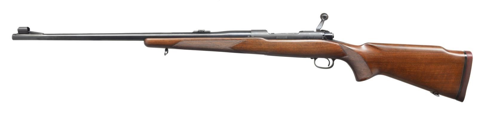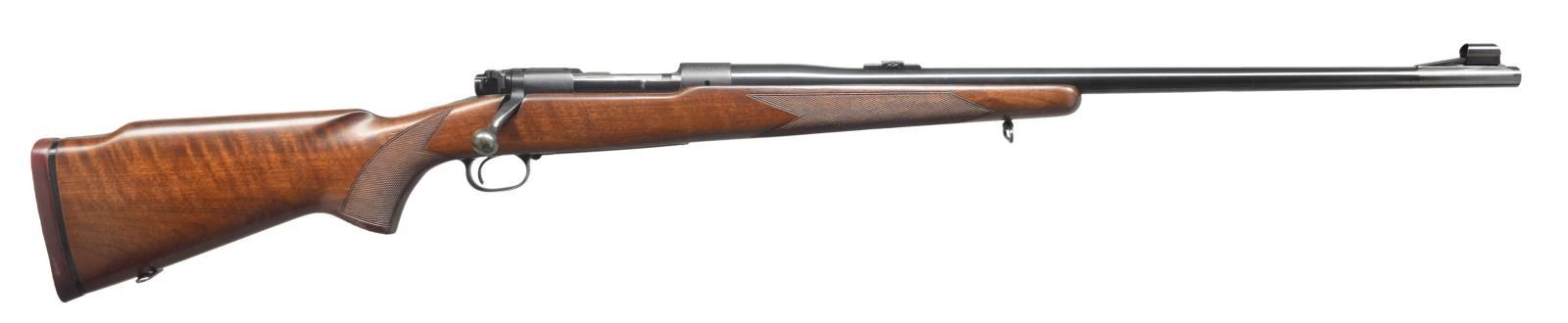 STANDARD GRADE IN .375 H&H. Cal. .375 H&H. S# 253068. Bbl. 25" is mounted w/ Lyman 6W dual folding leaf rear sight & silver bead front in matted integral ramp w/ hood. Winchester markings are on left side. Matte finished action has bolt w/ bright polished body & steel hinged floorplate. Pistol grip Monte Carlo stock of lightly fiddle figured American walnut features red Winchester pad, sling loops, & point pattern checkering at grip & forend. CONDITION: bbl. & action retaining over 95% original blue w/ some high edge wear on bbl. & action w/ silvering & light flecking on floorplate. 1 Or 2 minor marks in wood finish. Sharp shiny bore. Mechanically fine. A very fine example of this desirable rifle. (20-3971/MGM). CURIO. $3,000-4,500.