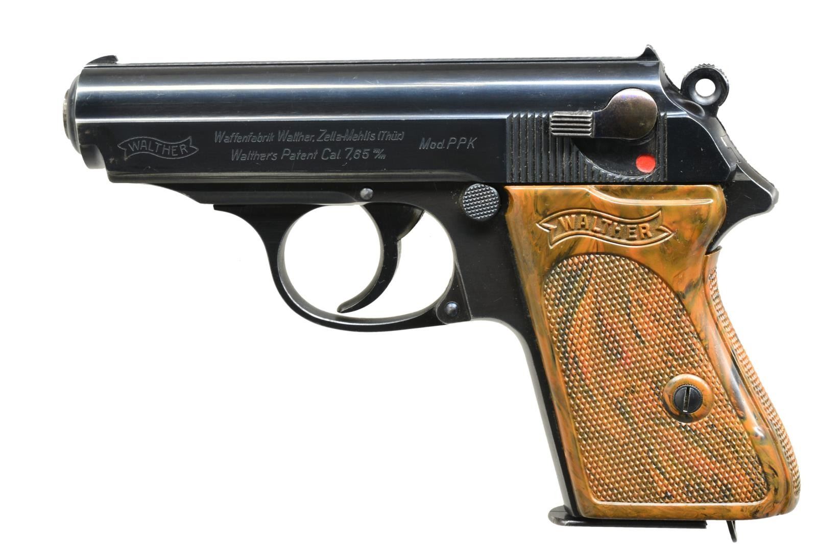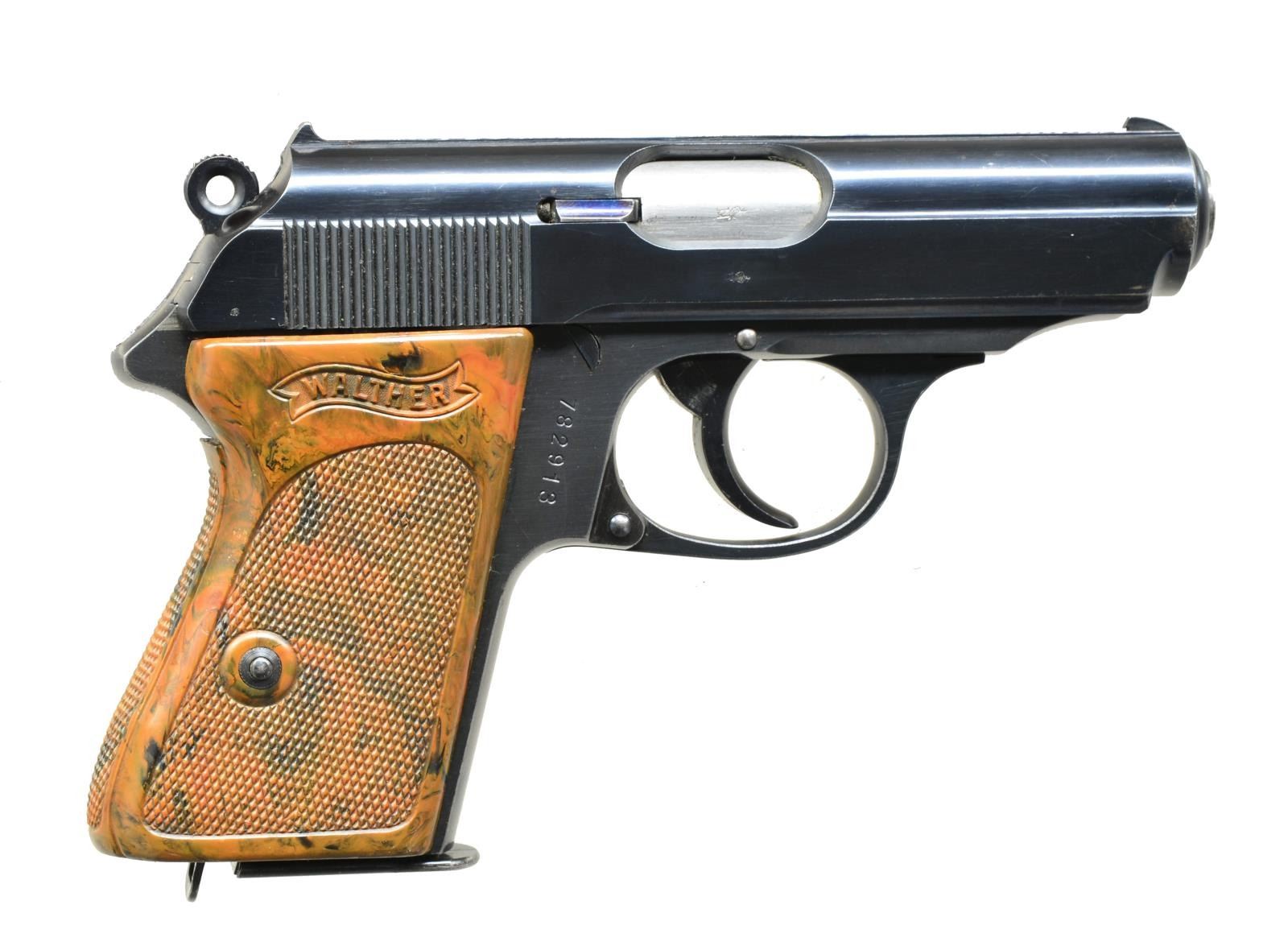 90 DEGREE SAFETY. Cal. 7.65mm. S# 782913. Standard configuration w/ crown “N” proof on polished bbl. housing, bbl. & slide under ejection port. All proper Walther markings on left side of slide w/ 90 degree safety. Frame w/ S# approximating 1933 production has 1 piece wraparound grip & Walther banner mag. w/ steel bottom. CONDITION: exceptionally fine, slide w/ some minor silvering & 1 or 2 light cleaned pits at muzzle end & a hint of high edge wear on body of slide. Frame w/ some sharp edge wear mostly at right rear of trigger guard. Safety retains most of its bright blue. Mag. also in fine condition, silvered on edges. Grip is very fine w/ no noted cracks & very little shrinkage. (20-3367/MGM). CURIO. $1,000-1,500.
