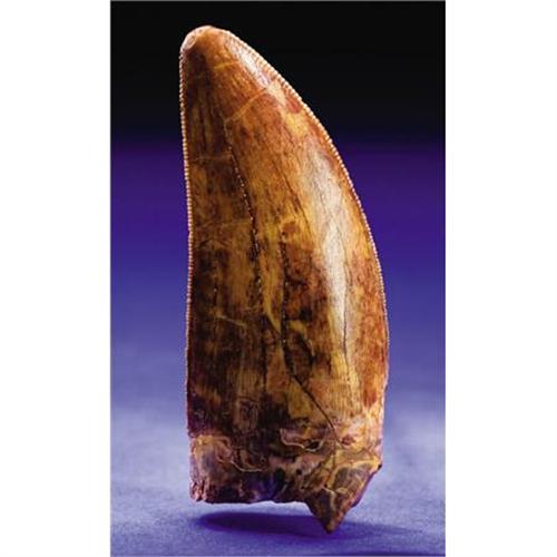 <B>SUPERB DINOSAUR TOOTH</B></I><BR> <I>Carcharodontosaurus saharicus <BR>Cretaceous, Albian stage<BR>Kem-Kem Basin, near Taouz, K'Sar es Souk Province, Morocco</B></I><BR>The "shark-toothed" dinosaur had some of the most fearsome teeth to be found anywhere on the planet, at any time. Knowing that they belonged also to the largest carnivore ever to walk the earth only adds to their terrifying aspect. This lot is a first-class example, with fine enamel and serrations still sharp enough to cut meat. It is 3 inches long over the curve and the fine brown patination is equally well preserved on both sides.<BR>.<BR><BR><b>Shipping:</b> Requires 3rd Party Shipping (<a target="_blank" href="http://www.heritageauctions.com/common/shipping.php">view shipping information</a>)