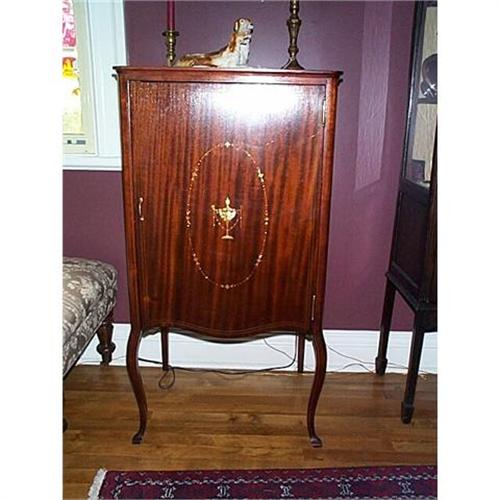 A REALLY GORGEOUS MUSIC CABINET WITH A VERY WELL DETAILED MOTHER OF PEARL MOTIF OF A CLASSIC GRECIAN STYLED URN. IN ADDITION, THERE IS SATINWOOD BANDING AROUND THE TOP, DOOR AND ELEGANTLY CARVED QUEEN ANNE LEGS. THE INTERIOR WOULD HOLD 6 SLATS FOR SHEET MUSIC...UNFORTUNATELY THERE IS ONLY ONE LEFT. MADE OF A THIN PIECE OF WOOD, THESE ARE INEXPENSIVE TO BUY OR HAVE MADE. IDEA TO HOLD A STEREO, OR JUST KEEP 'STUFF' IN. VERY ELEGANT, VERY REASONABLY PRICED. STANDS 41" TALL, 21" ACROSS AND 17" DEEP. GREAT FOR A COMPACT STEREO SYSTEM!