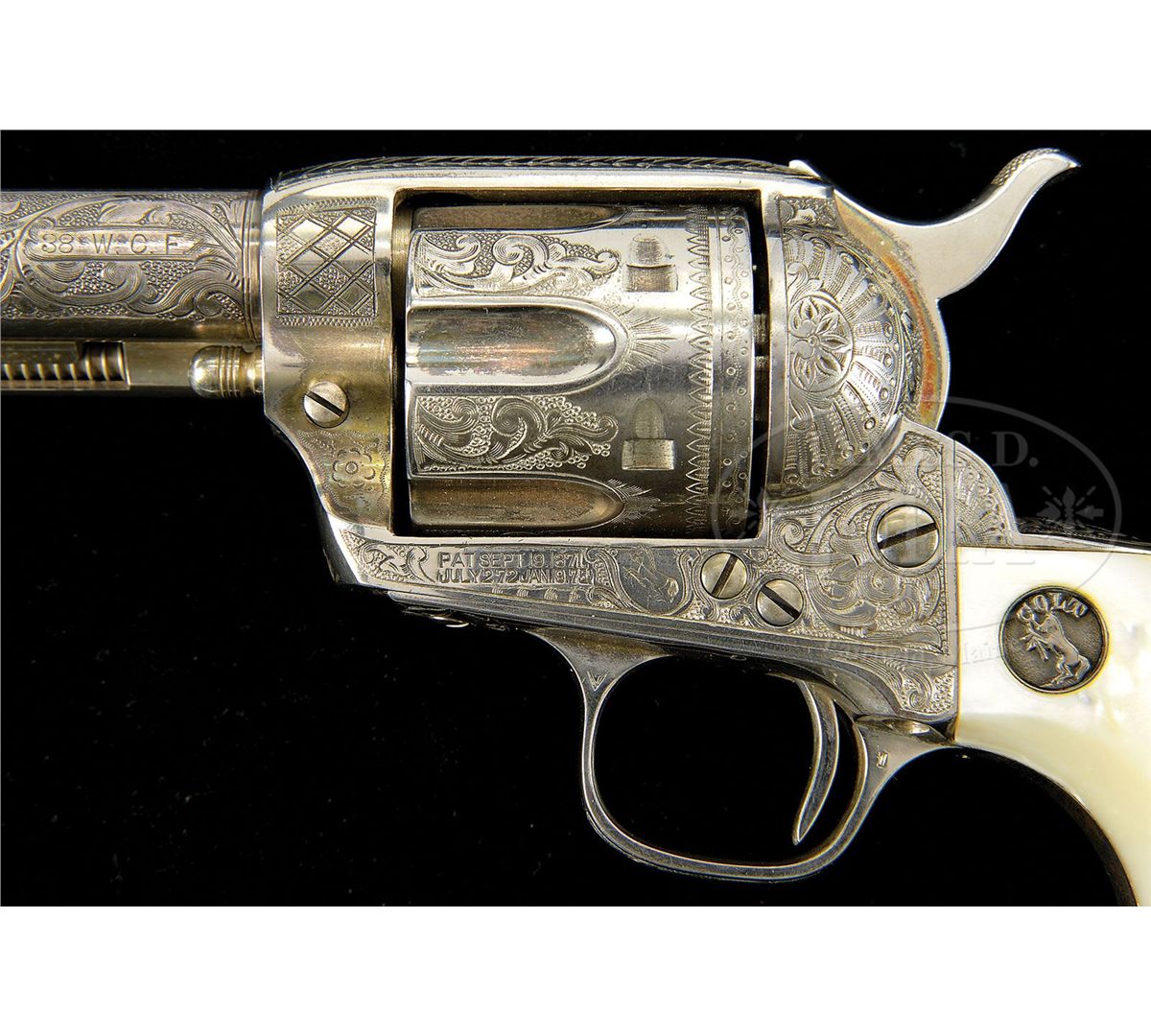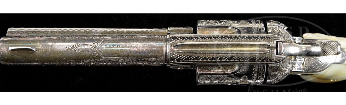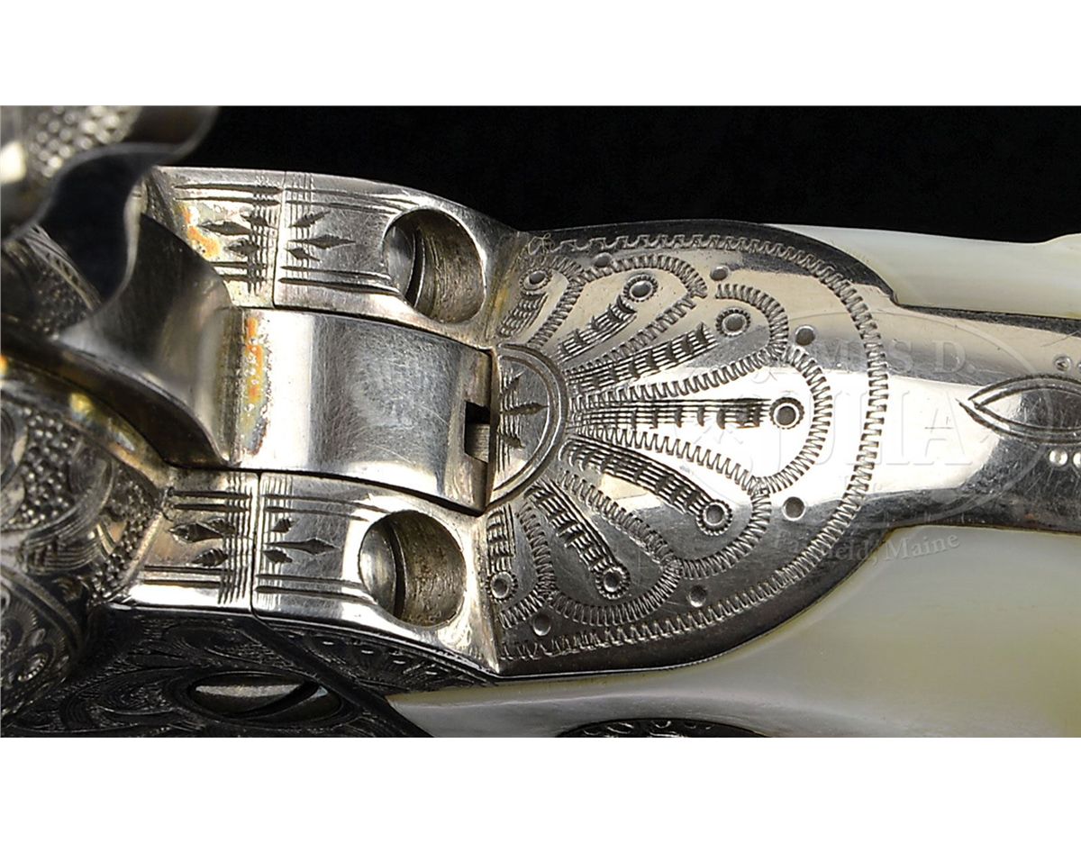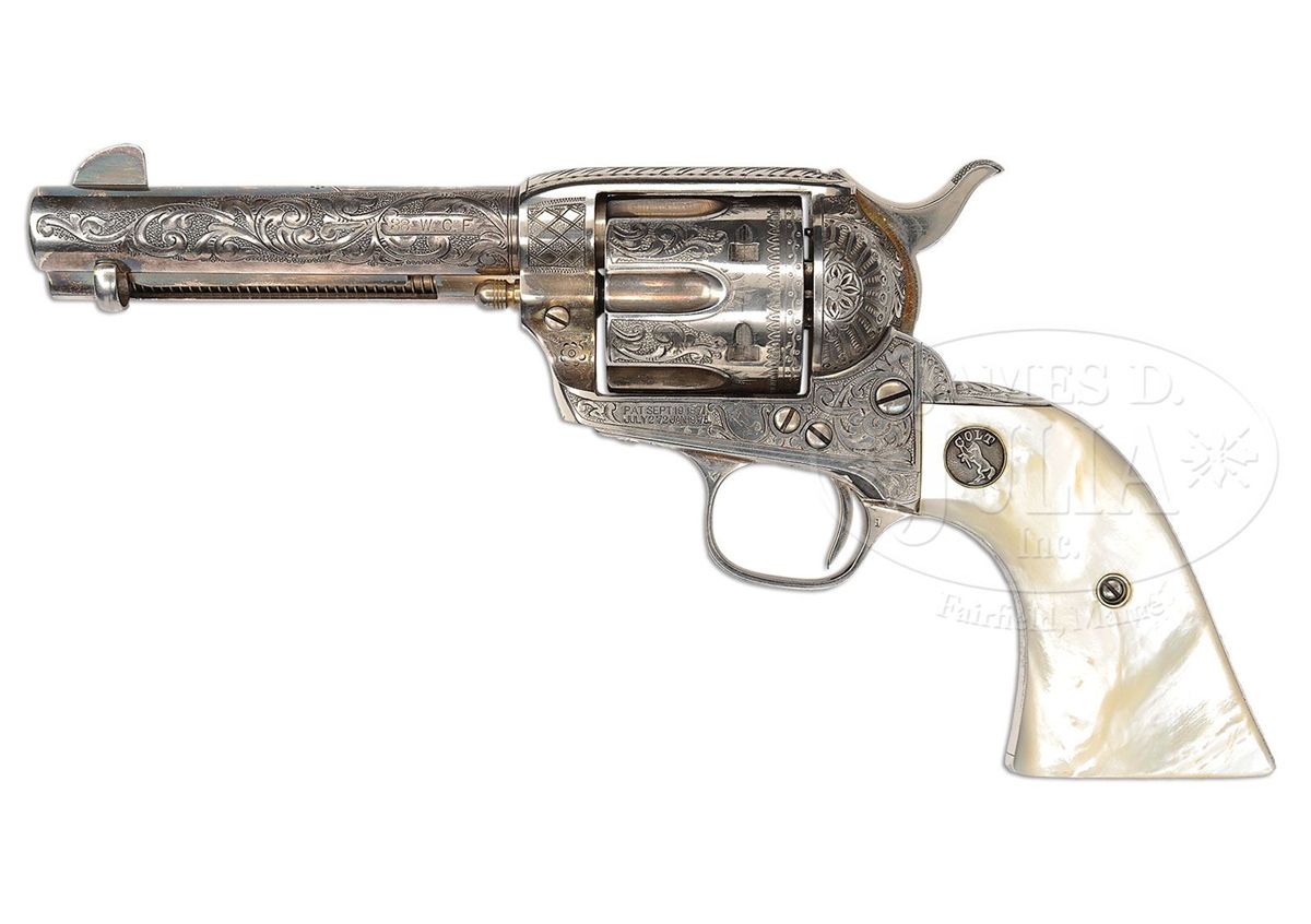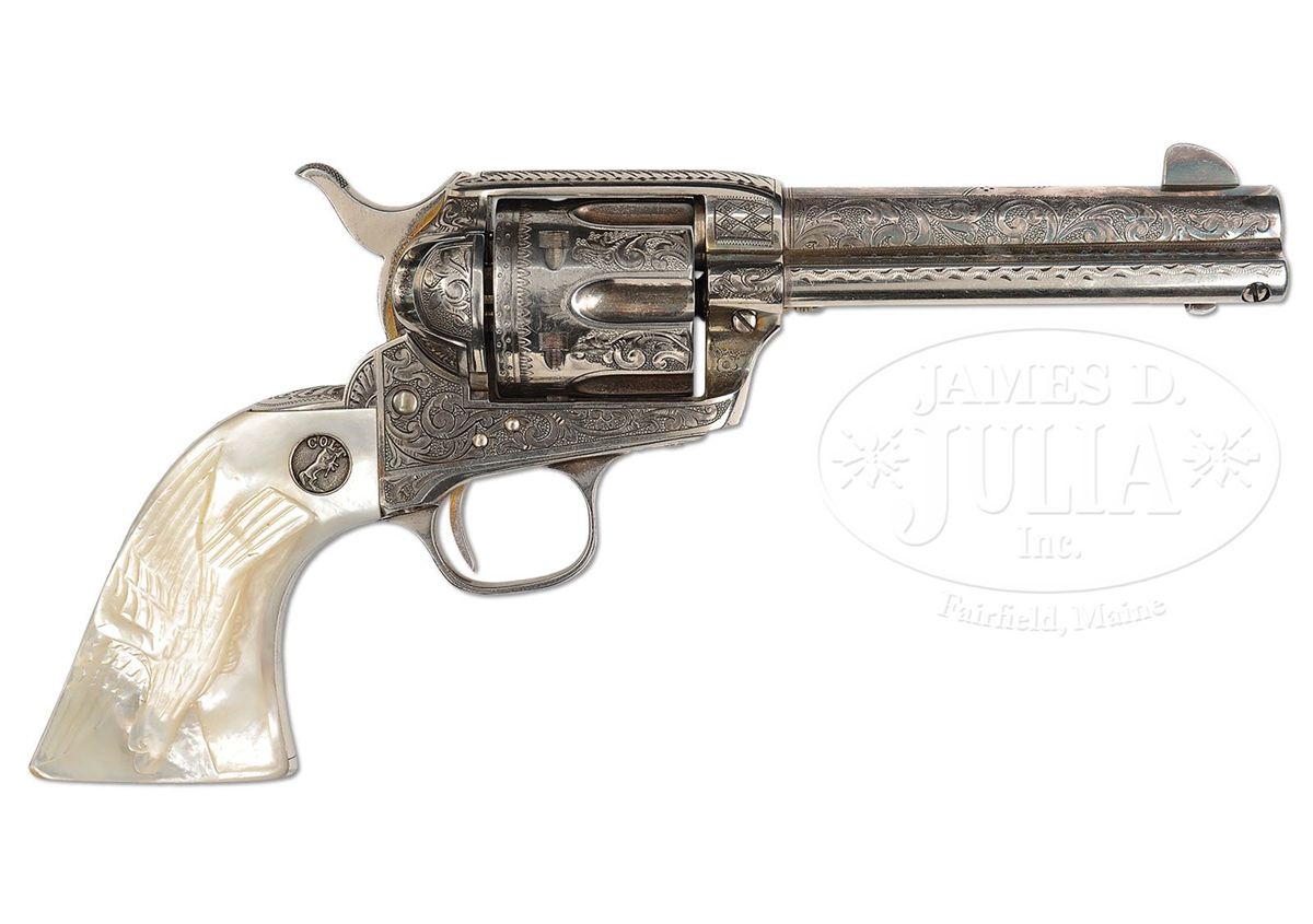 SN 335045. Cal .38 WCF (38-40. Spectacular silver finished Single Action with 4-3/4" bbl, full front sight and 2-line address with caliber marking on left side. Left side of frame has the 2-line, 3-patent dates and is mounted with spectacular 2-pc, Rampant Colt deep silver medallion pearl grips. Right side has a deep relief carved stooping eagle. Rear face of cylinder has last 4 digits of matching serial number. Revolver is engraved probably from the hand of the master himself, Cuno Helfricht, with about 80% coverage, very fine, intertwined foliate arabesque patterns with extremely fine pearled background. Left recoil shield is engraved in Mr. Helfrichts typical fan pattern with feather patterns on the top strap, diamond patterns on each side of bbl boss and his distinctive flower blossoms in the bottom front gullets. Matching foliate arabesque patterns extend the entire length of both sides of bbl with fine snake & dot patterns in the top gullet of the ejector housing along with fine zig-zag borders and leaf and vine pattern on the outer radius. Backstrap is engraved with Mr. Helfricht's distinctive fan pattern at the top with geometric patterns downs the back and buttstraps with another of his distinctive patterns on the trigger bow. Cylinder is engraved with matching foliate arabesque patterns on the lands between the flutes, a line border around the flutes with a small sunburst at the rear end of the flutes. Rear edge of the cylinder is beautifully engraved in scallop and snake & dot patterns. This is one of Mr. Helfricht's more elaborately engraved Single Actions. Accompanied by a Colt Factory letter which identifies this revolver in Cal 38-40 with 4-3/4" bbl, silver finish, pearl grips with carved eagle motif, factory engraved and sold to Globe Hardware Co., address unavailable, shipped to Simmons Hardware Co., St. Louis, MO on January 24, 1917 in a one gun shipment. The Globe Hardware Co. in the letter, is located in Globe, AZ, and has been in business from 1898 to the present. Contact with a granddaughter of the orig owner of the company disclosed that some of the old records are still available. A search of those records disclosed that this revolver was received January 30, 1917 from Simmons Hardware Co. and was sold the same day to Alvin Booth. Contact with the Gila County, AZ Historical Museum revealed that Alvin Booth, a "colored" man, was born April 1, 1868 in Hillsboro, TX, settling in Globe to do handyman and janitorial services around town. Booth was a well known and respected figure in Globe, being employed by several prominent bankers and businessmen in town. Booth was very frugal, saved his money and purchased several investment properties in the area, becoming somewhat well-to-do. In 1913 he was chosen to attend the Emancipation Convention in Philadelphia to represent the Arizona colored population at the convention. His appointment was made by Governor George W. P. Hunt, who Booth had worked for when the governor was a businessman in Globe. He was also a delegate in 1920 to the convention of the Industrial and Commercial Council of People of African Descent. He was mentioned in “Arizona’s Black Pioneers” and several other publications noting prominent people of early Arizona. Booth died March 16, 1937 in Globe, AZ, and was laid to rest in the “white man’s cemetery” next to his father who had joined him in Globe in his later years. PROVENANCE: Fax correspondence from Gila County, AZ Historical Museum. CONDITION: Extremely fine plus and all matching. Overall retains virtually all of its crisp, orig silver finish which is lightly oxidized, showing no wear. Revolver appears to be new and unfired. Grips are crisp with no visible flaws. Mechanics are crisp, brilliant shiny bore shows no evidence of having ever been fired. An absolutely spectacular example of the engravers art and finisher's polishing skills. This revolver is nearly identical to another Single Action from the same time frame, being sold elsewhere in this auction. 4-49405 JR311