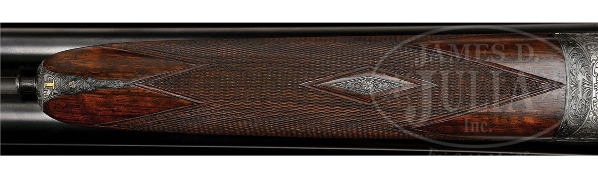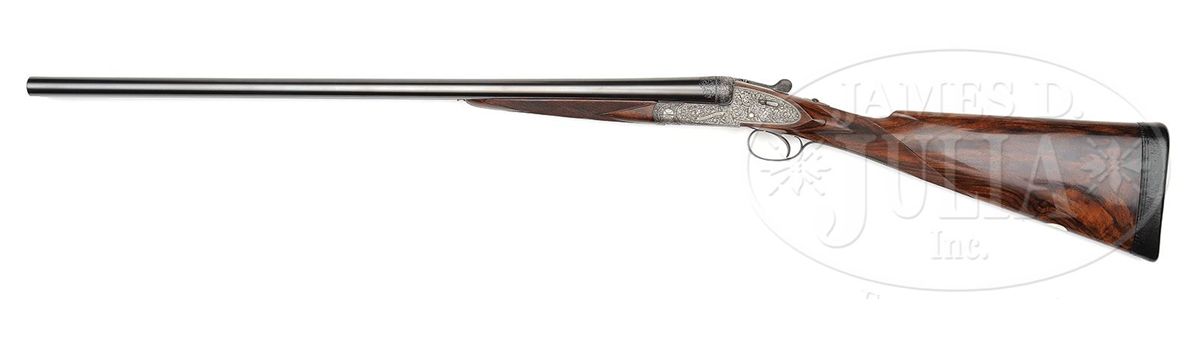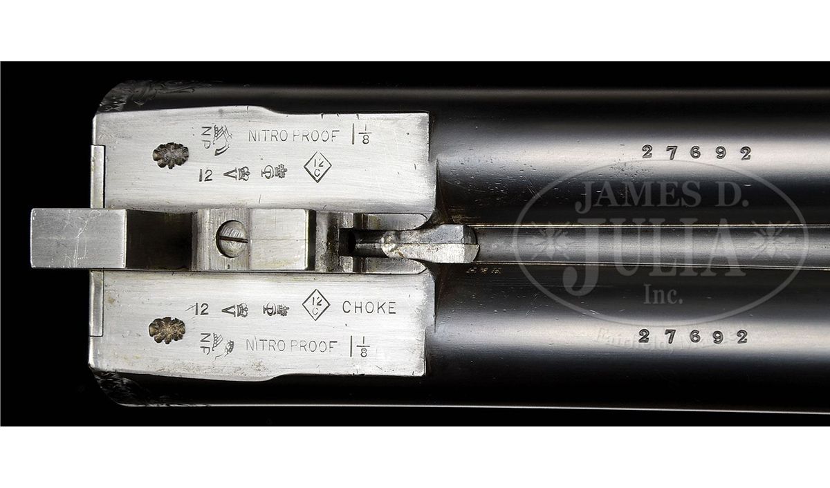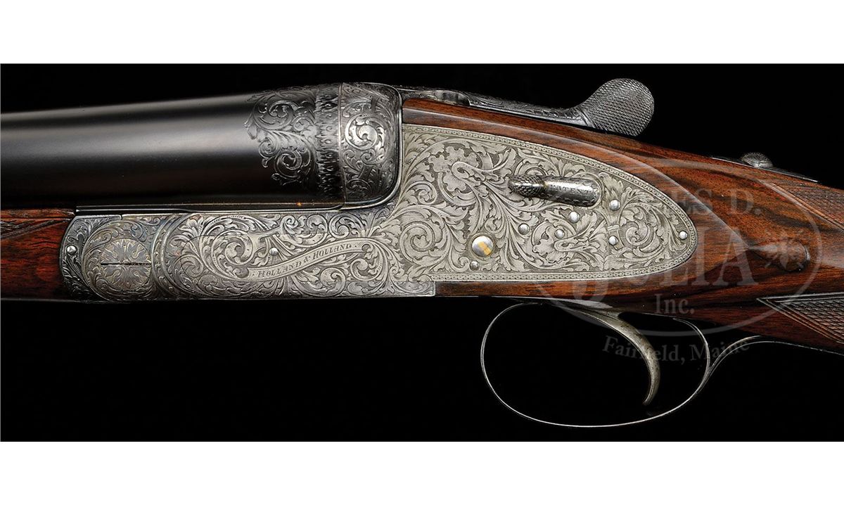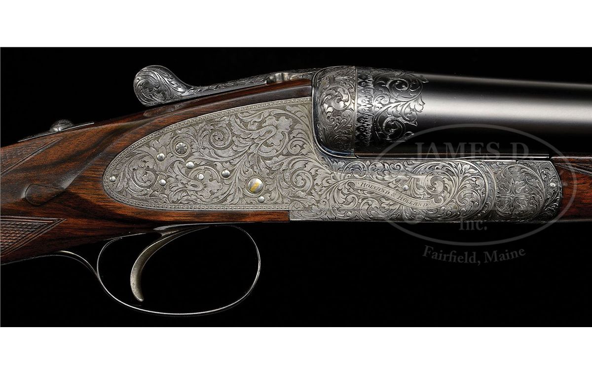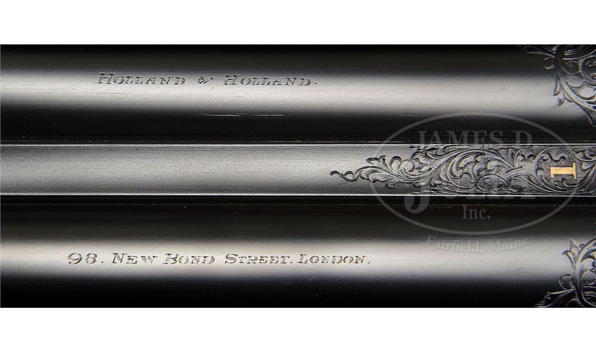 SN 27692. (1916 per factory letter) Cal. 12 ga. 2-3/4" Chambers. 28" Chopper lump bbls with narrow, swamped, concave game rib are engraved "Holland & Holland" and "98. New Bond Street. London." on tops. Rear of rib and breech ends of bbls are engraved with feather border and about 3/4" of open, flowing, scrolled acanthus. Gun is no. "1" of a pair, with "1" gold inlaid at rear of rib, on top lever, and forend tip. Bbl flats are stamped with London nitro proofs for 1-1/8 oz of shot (2-1/2"). Case hardened Royal action has rounded bar with well filed beads, and is fitted with automatic safety (SAFE inlaid in gold) and Holland non-selective single trigger. Action also features hidden third fastener, gold band tumbler end cocking indicators, and Holland patent detachable sidelocks. Action and lockplates are engraved with exceptionally well cut, classic, Holland deluxe, large, semi-relief, shaded, scrolled acanthus with some strapwork highlights. "Holland & Holland" is in scrolled band on the front of each plate. This fine engraving surrounds a vignette of a pair of pheasants at front bottom of action (factory information indicates "engraved with game subjects"). Single beaded, small bow, trigger guard is engraved with matching scroll and with SN on short tang. Beautifully marbled and lightly figured European walnut straight grip buttstock measures 15-1/16" over black leather covered pad, and features diamond hand, drop points, classic point pattern checkering at grip, and a vacant silver oval on toe line. Matching splinter ejector forend has Anson release. Bore diameter: left-.729, right -.729. Bore restrictions: left -.005 (IC), right -.005 (IC). Wall thickness: left -.026, right -.025. Drop at heel: 1-7/8", drop at comb: 1-5/16". Weight: 6 lbs. 14 oz. LOP: 15-1/16". Orig makers leather case is lined in scarlet cloth with patterned, black leather, gold embossed H & H label, cleaning instruction label, and orig charge card for this gun, in lid. Case contains 3-pc brass and ebony cleaning rod with brushes and mop, and remains of case straps. PROVENANCE: Factory letter with "weapon history" and copy of ledger page. CONDITION: Fine, as partially refurbished. Bbls retain essentially all of a fine satin re-black, engraving slightly softened. Action retains a considerable amount of its orig case hardening color, mostly in background of engraving, which is very pleasingly silvered. Top lever and trigger guard retain nearly all of a quality re-blue. New buttstock is very well crafted in Holland style, and retains nearly all of its orig finish. Checkering is still bright. Orig forend wood has been nicely freshened. Bores are excellent. Action is tight. Ejectors are in time. Trigger works. Case leather is dark, corners worn through, and with numerous marks and scrapes. What appears to be orig handle is good. Interior cloth is considerably soiled with a few rubs through. Labels are good. Cleaning label is chipped at corner. Charge card is foxed, soiled, and rubbed. Cleaning rod is good. Straps are dry and broken. Deluxe grade guns from H&H's "prime period" are quite rare and very desirable. 4-49199 MGM233