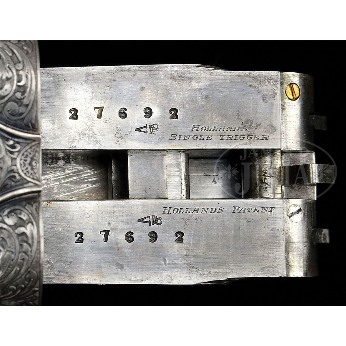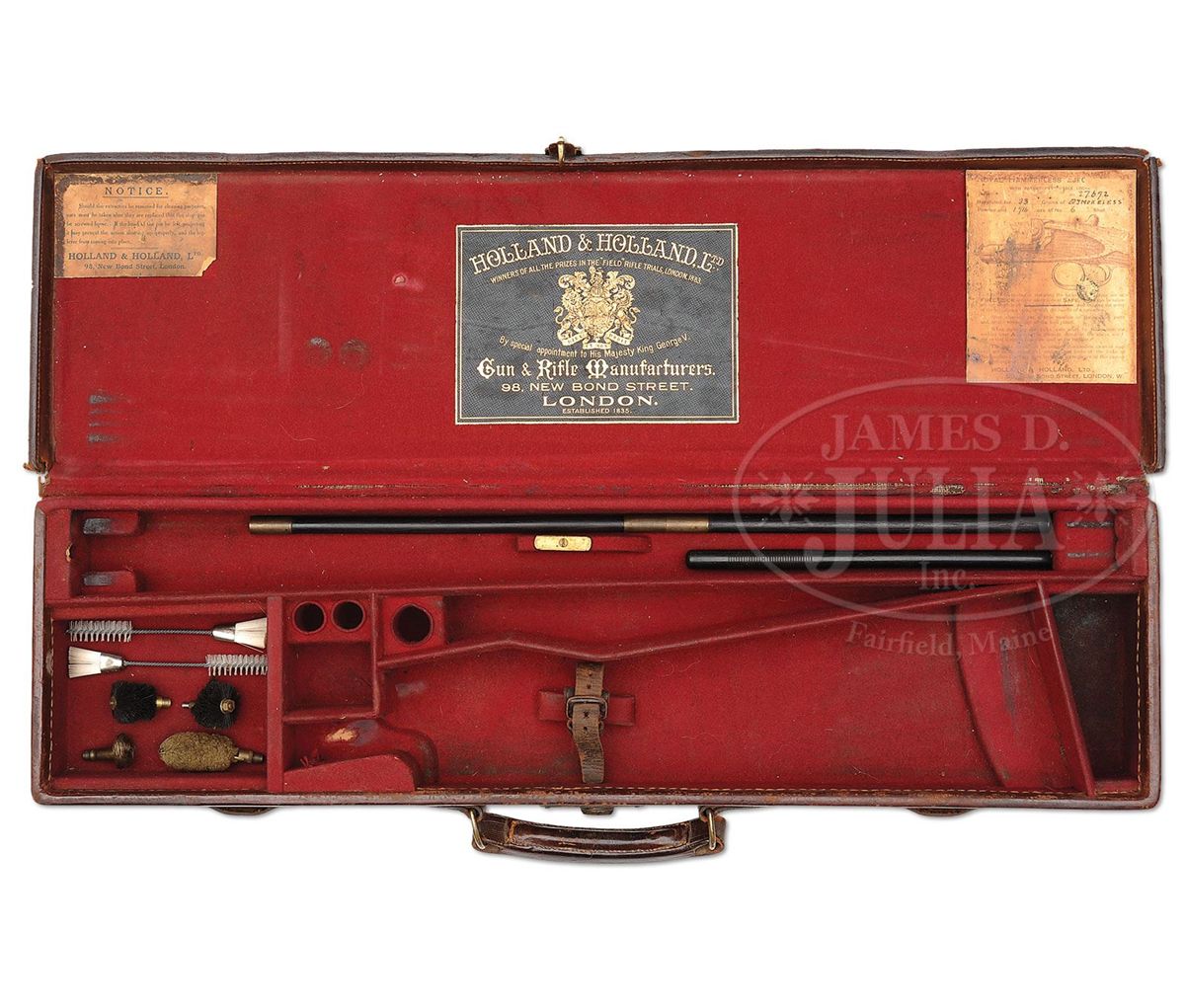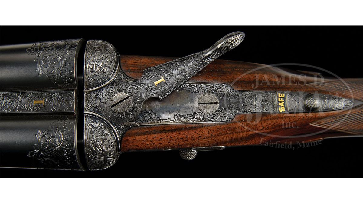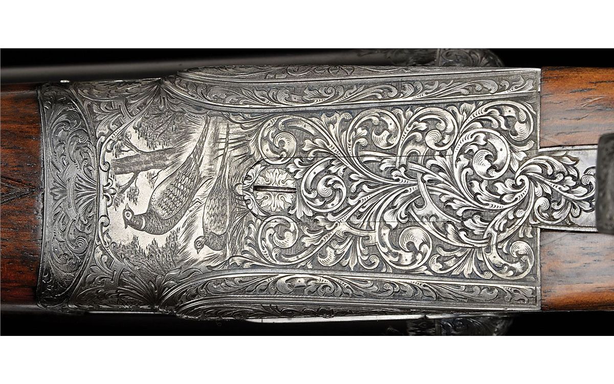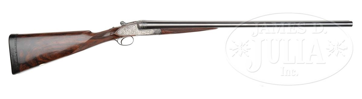 SN 27692. (1916 per factory letter) Cal. 12 ga. 2-3/4" Chambers. 28" Chopper lump bbls with narrow, swamped, concave game rib are engraved "Holland & Holland" and "98. New Bond Street. London." on tops. Rear of rib and breech ends of bbls are engraved with feather border and about 3/4" of open, flowing, scrolled acanthus. Gun is no. "1" of a pair, with "1" gold inlaid at rear of rib, on top lever, and forend tip. Bbl flats are stamped with London nitro proofs for 1-1/8 oz of shot (2-1/2"). Case hardened Royal action has rounded bar with well filed beads, and is fitted with automatic safety (SAFE inlaid in gold) and Holland non-selective single trigger. Action also features hidden third fastener, gold band tumbler end cocking indicators, and Holland patent detachable sidelocks. Action and lockplates are engraved with exceptionally well cut, classic, Holland deluxe, large, semi-relief, shaded, scrolled acanthus with some strapwork highlights. "Holland & Holland" is in scrolled band on the front of each plate. This fine engraving surrounds a vignette of a pair of pheasants at front bottom of action (factory information indicates "engraved with game subjects"). Single beaded, small bow, trigger guard is engraved with matching scroll and with SN on short tang. Beautifully marbled and lightly figured European walnut straight grip buttstock measures 15-1/16" over black leather covered pad, and features diamond hand, drop points, classic point pattern checkering at grip, and a vacant silver oval on toe line. Matching splinter ejector forend has Anson release. Bore diameter: left-.729, right -.729. Bore restrictions: left -.005 (IC), right -.005 (IC). Wall thickness: left -.026, right -.025. Drop at heel: 1-7/8", drop at comb: 1-5/16". Weight: 6 lbs. 14 oz. LOP: 15-1/16". Orig makers leather case is lined in scarlet cloth with patterned, black leather, gold embossed H & H label, cleaning instruction label, and orig charge card for this gun, in lid. Case contains 3-pc brass and ebony cleaning rod with brushes and mop, and remains of case straps. PROVENANCE: Factory letter with "weapon history" and copy of ledger page. CONDITION: Fine, as partially refurbished. Bbls retain essentially all of a fine satin re-black, engraving slightly softened. Action retains a considerable amount of its orig case hardening color, mostly in background of engraving, which is very pleasingly silvered. Top lever and trigger guard retain nearly all of a quality re-blue. New buttstock is very well crafted in Holland style, and retains nearly all of its orig finish. Checkering is still bright. Orig forend wood has been nicely freshened. Bores are excellent. Action is tight. Ejectors are in time. Trigger works. Case leather is dark, corners worn through, and with numerous marks and scrapes. What appears to be orig handle is good. Interior cloth is considerably soiled with a few rubs through. Labels are good. Cleaning label is chipped at corner. Charge card is foxed, soiled, and rubbed. Cleaning rod is good. Straps are dry and broken. Deluxe grade guns from H&H's "prime period" are quite rare and very desirable. 4-49199 MGM233