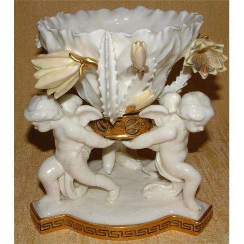 Exceptional Moore Porcelain Centerpiece of impressive size depicting a trio of winged cherubs holding a circular bowl with lavish applied decoration, late 19th Century. <p> Superb condition allover with no losses and no wear to gilding. <p> Height: 7.75? (20cm). Width: (base) 7.5? (19cm).