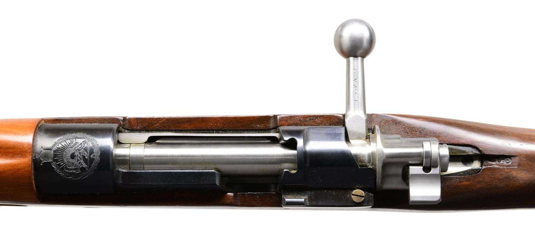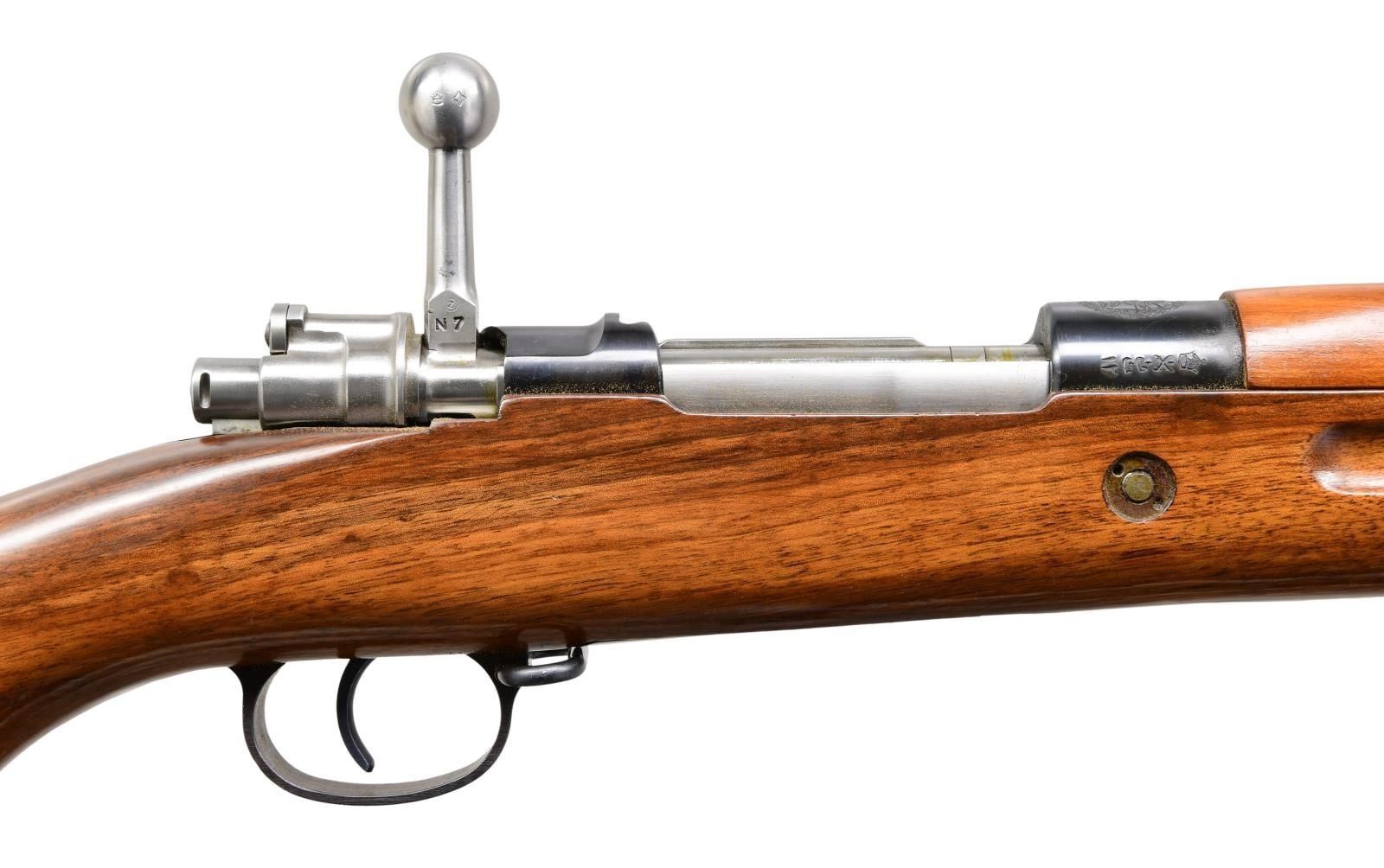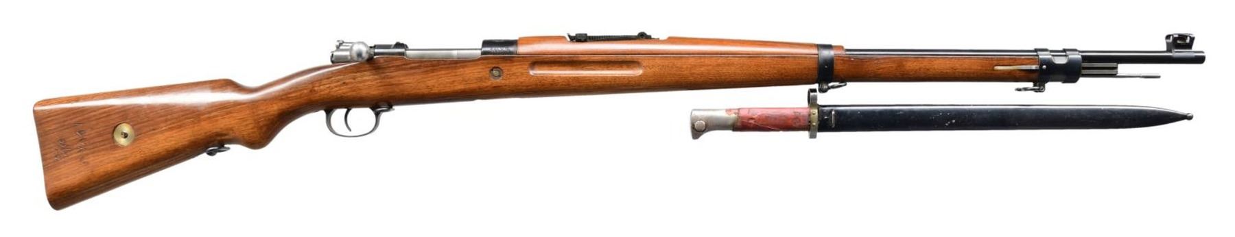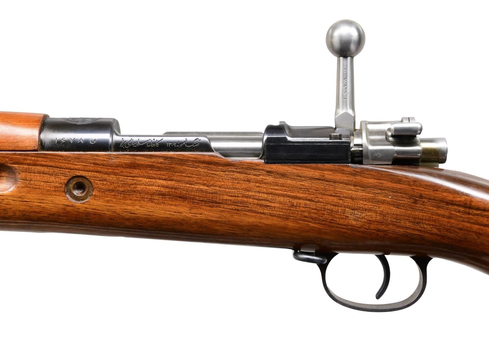 Cal. 8x57 (8mm Mauser). S# 1678d (translated from Farsi). Bbl. 29". Blade front sight w/ protective ears. Tangent rear sight w/ Farsi graduations. All visible matching numbers. High condition Persian 98/29 Mauser rifle made by Brno. Receiver top has ornate Persian lion crest. Both sides of receiver have various Farsi & Persian markings. No visible import markings but maybe import marked under wood. Blued finish. Walnut stock set w/ bottom mounted sling swivels. Cleaning rod present. UNATTACHED ACCESSORIES: factory test target **test target number is the number to a different rifle.** & matching numbered bayonet w/ scabbard. Bayonet has cosmoline & wax remnants. Metal of bayonet remains partially bright w/ some scattered oxidation. CONDITION: stock set retains a high degree of arsenal varnish w/ some scattered dings & handling marks. Metal retains 97% original blue w/ some light scratches. Action functions properly. Very good plus bright bore. PROVENANCE: Collection of Dr. Fred Novy, ASAC. (24-1830/MJC). CURIO. $1,500-2,500.