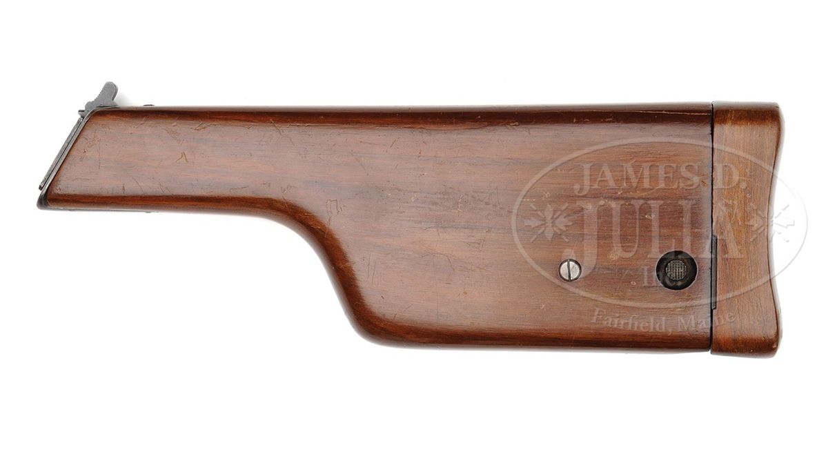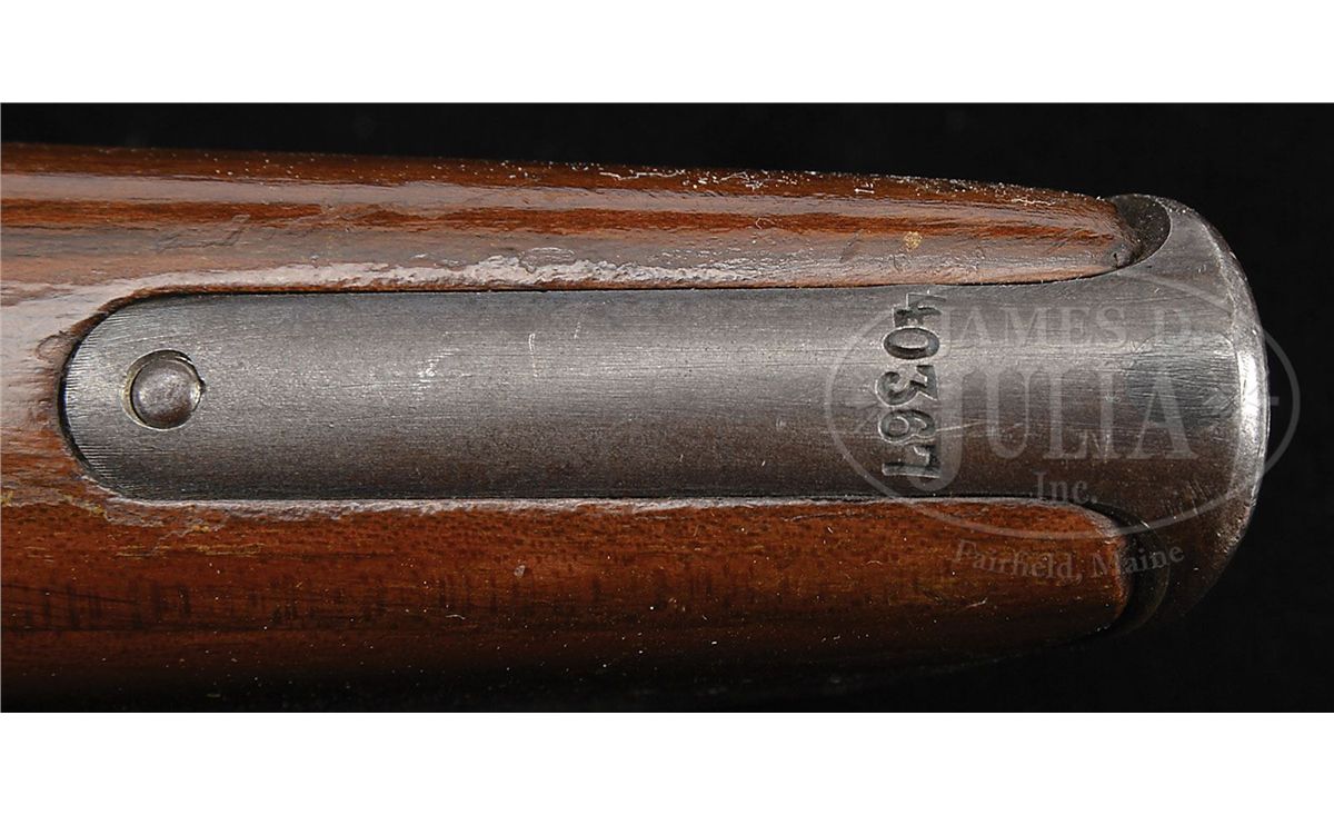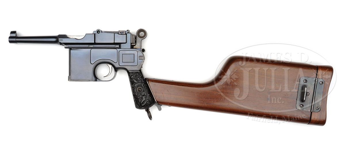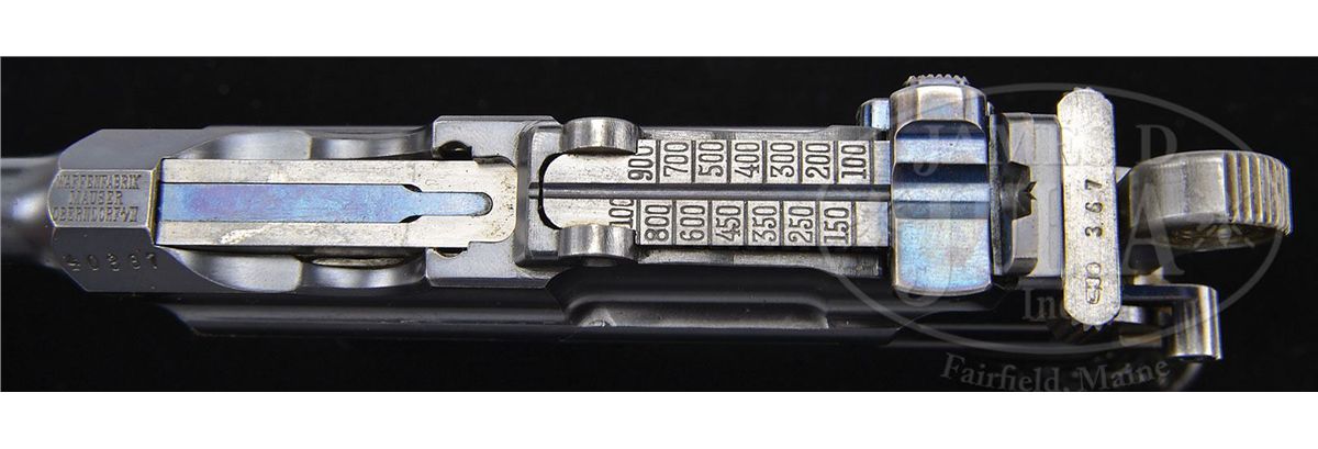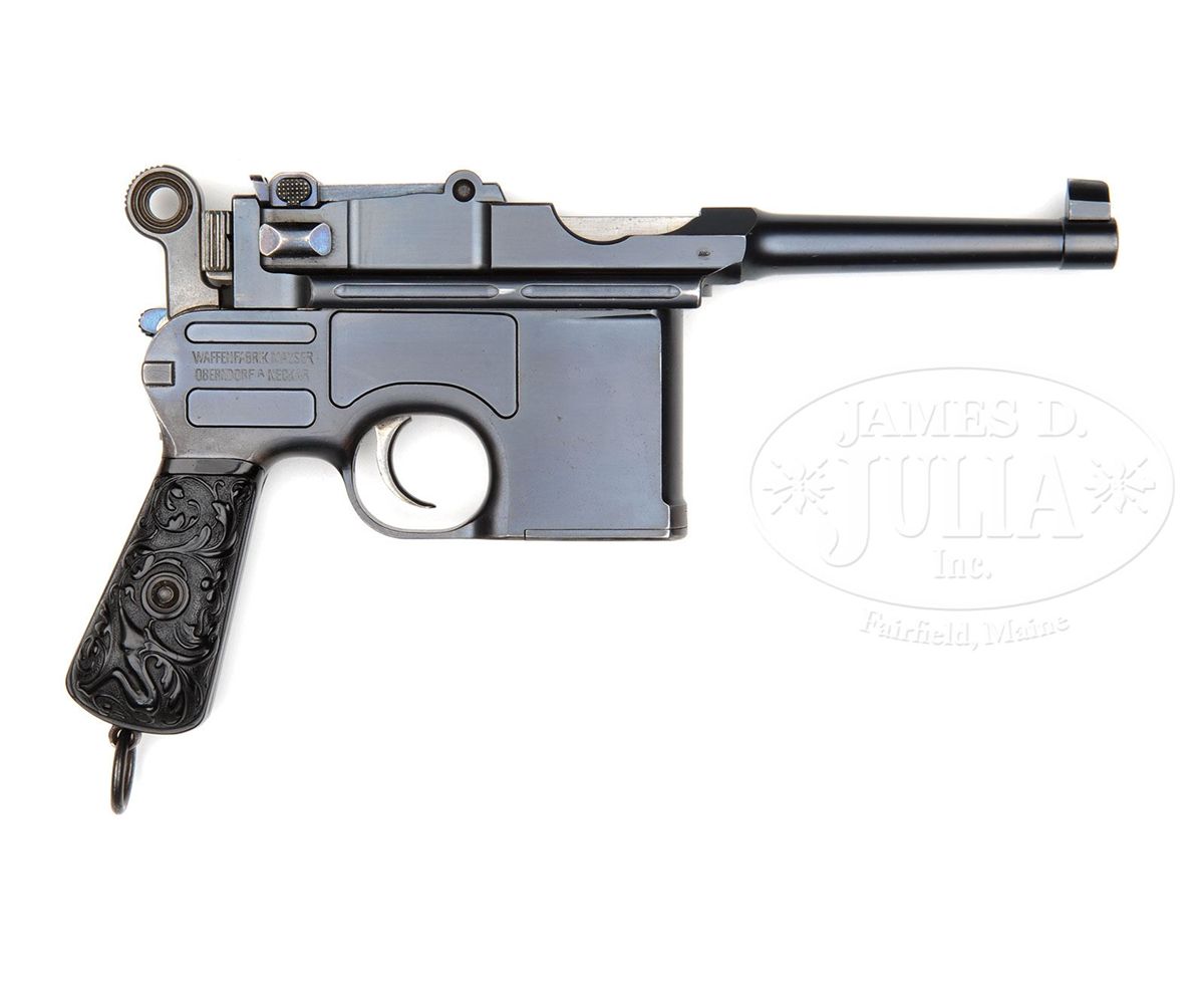 SN 40367. Caliber 7.63mm. Mauser made several Bolo variations in the 40000 serial range. This example has a 4" bbl and the desirable grooved 100-1000 rear sight. Usual Mauser address on the chamber and the full serial number on the left chamber flat. The left side of the bbl extension is marked with a Crown U. The right side with the antler proof. The usual two line address is on the right side of the frame. Early features include the long extractor and a large ring hammer. The firing pin is strawed and has two lugs. Fire blued parts include the extractor, cursor, bolt stop, safety, and grip screw. Trigger is strawed. Disassembly shows all matching parts including the firing pin and hard rubber floral grips each scribed with the full serial number of the gun. Complete with matching Bolo stock having an original untouched lug. The lid recess for the large ring hammer has been expanded for easier closure. PROVENANCE: Joseph J. Schroeder, Jr. Collection. CONDITION: Original blue estimated at 95-97% with most wear and fading along the front of the magazine well and the right frame just above the grip along with the front and back strap. Comparable condition fire blue and straw on the small parts. The hard rubber grips are extremely well detailed with only very minor handling marks. Bright bore with strong rifling and only minimal oxidation. Perfect mechanics. The body of the stock has been revarnished and the hinge may have been replaced, judging from its etched surface. As expected, the lug has faded to a gray-brown-blue. 4-48568 LMA18