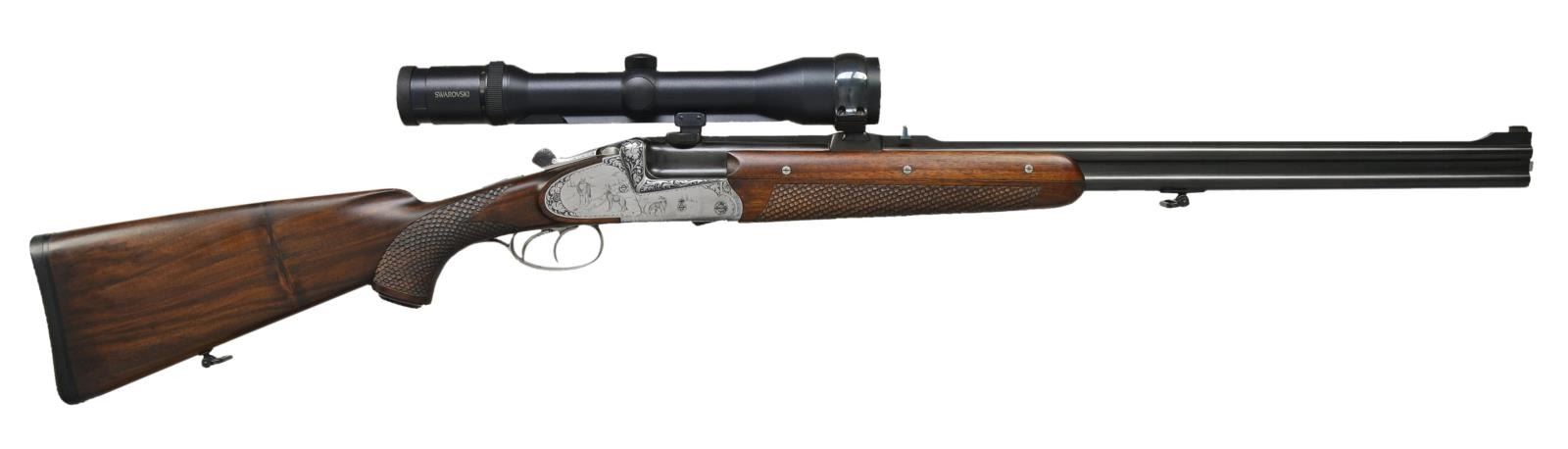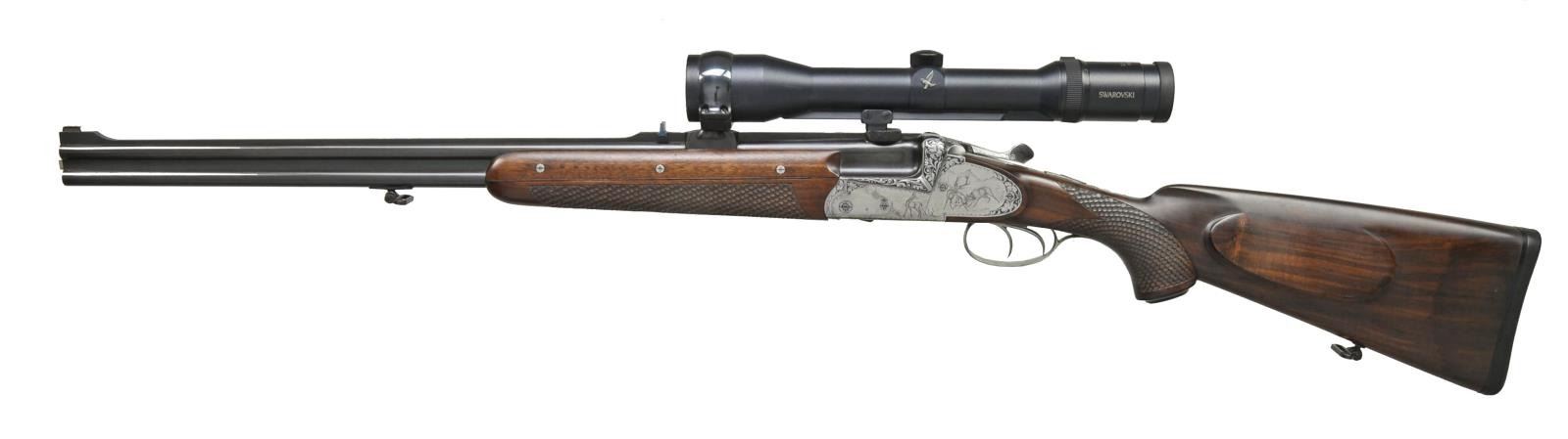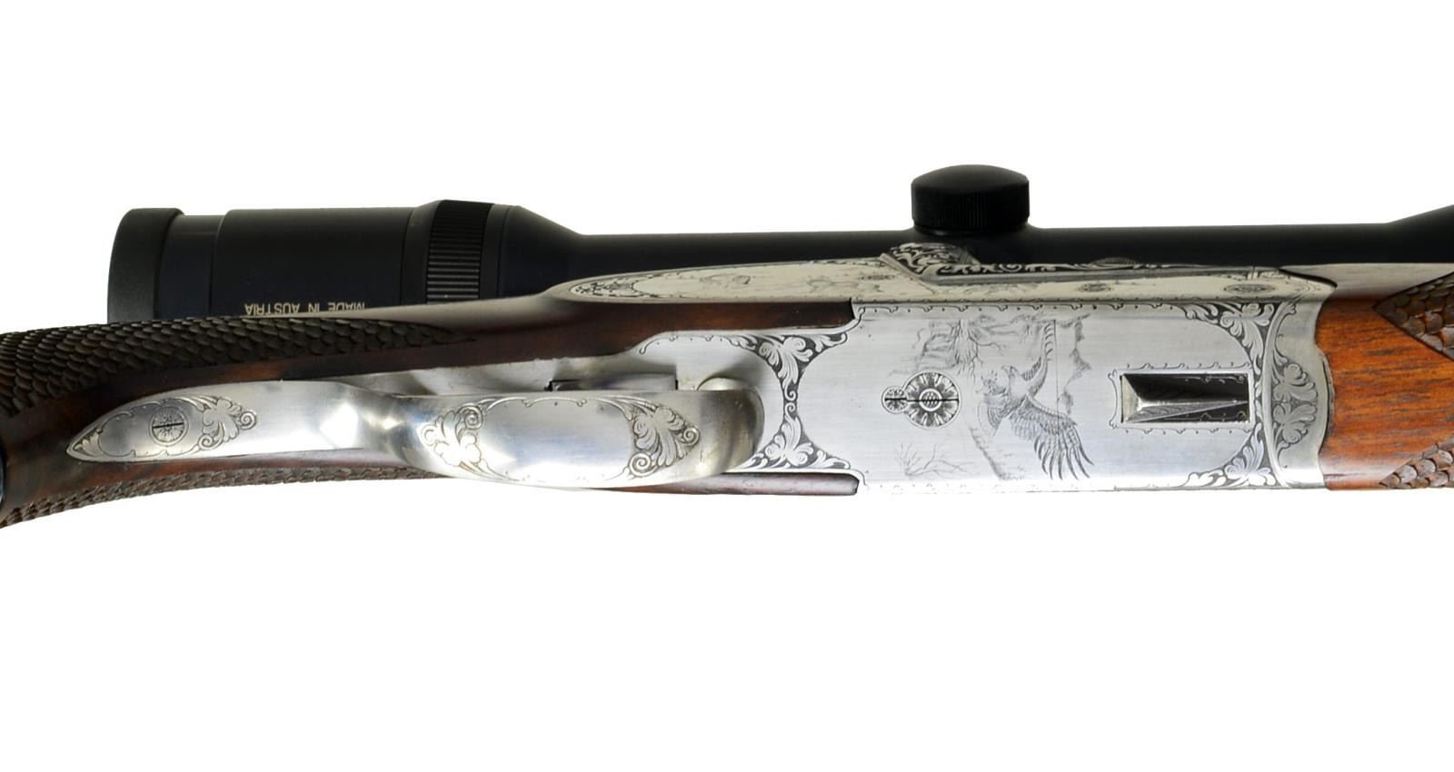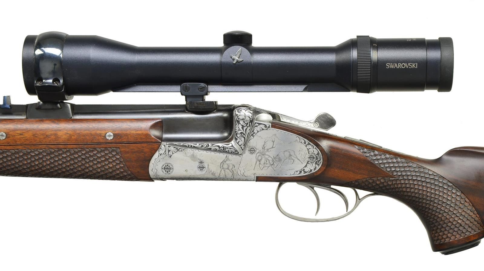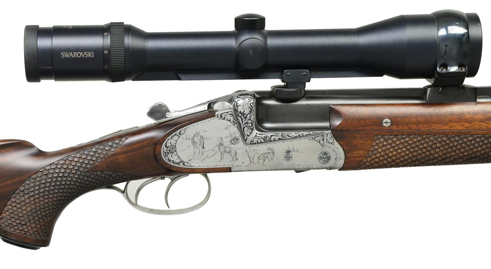 O/U DOUBLE RIFLE W/ SWAROVSKI SCOPE BY BERNHARD FRITZ W/ AMERICAN THEMED BULINO ENGRAVING BY F. OBERDORFER. Cal. 30-06. S# 322536. Bbls. 25" demi-bloc & are fitted w/ matted top rib, center portion milled away forming quarter rib & front sight ramp. Quarter rib is fitted w/ one standing leaf U-notch rear sight & claw scope bases. Front ramp has silver bead. Top of rib is engraved "BERNHARD FRITZ" "FICHTENBERG". Bbls. are stamped w/ 1992 Oberndorf nitro proofs. Coin finished, double Kersten blitz o/u action has decorative side plates. Action also features automatic tang safety, bushed strikers & double triggers (front set). Action & sideplates are masterfully engraved w/ sprays of shaded acanthus scroll surrounding vignettes of Western American game & birds w/ a pair of sparring elk in mountainous background that are being watched by a cow in foreground & left side & w/ a trio of howling wolves on right. Bottom of action portrays a golden eagle landing in her mountain aery. This attractive work is in simplified bulino style & signed "F. Oberdorfer" on right side. Reinforcing bolsters on action are finely relief engraved w/ acanthus & scroll. Trigger guard is steel. Dark, well streaked European walnut capped pistol grip buttstock measures 14 5/8" over black rifle pad. Stock features shadowline right hand cheekpiece & point pattern of well cut scales as checkering. Matching 3 piece ejector forend has Deely release. Rifle is mounted w/ Swarovski 30mm 2.5-10 "Habicht" rail scope w/ 3 post & cross hair reticle in claw rings. MEASUREMENTS: DAC approx. 1 3/4". DAH approx. 2 7/8". Cast 1/4" off. WEIGHT: w/ scope is 9 lbs. 12 oz. CONDITION: exceptionally fine, very close to "as new" w/ evidence of very little firing since proofed w/ only a few minor handling & assembly marks on all wood & metal surfaces, most notably a sm. 3/16" fairly deep ding on left side of butt near pad. Bores are excellent, mechanically excellent. Scope has a few minor marks, optically clear. (20-2387/MGM33). MODERN. $6,000-12,000.