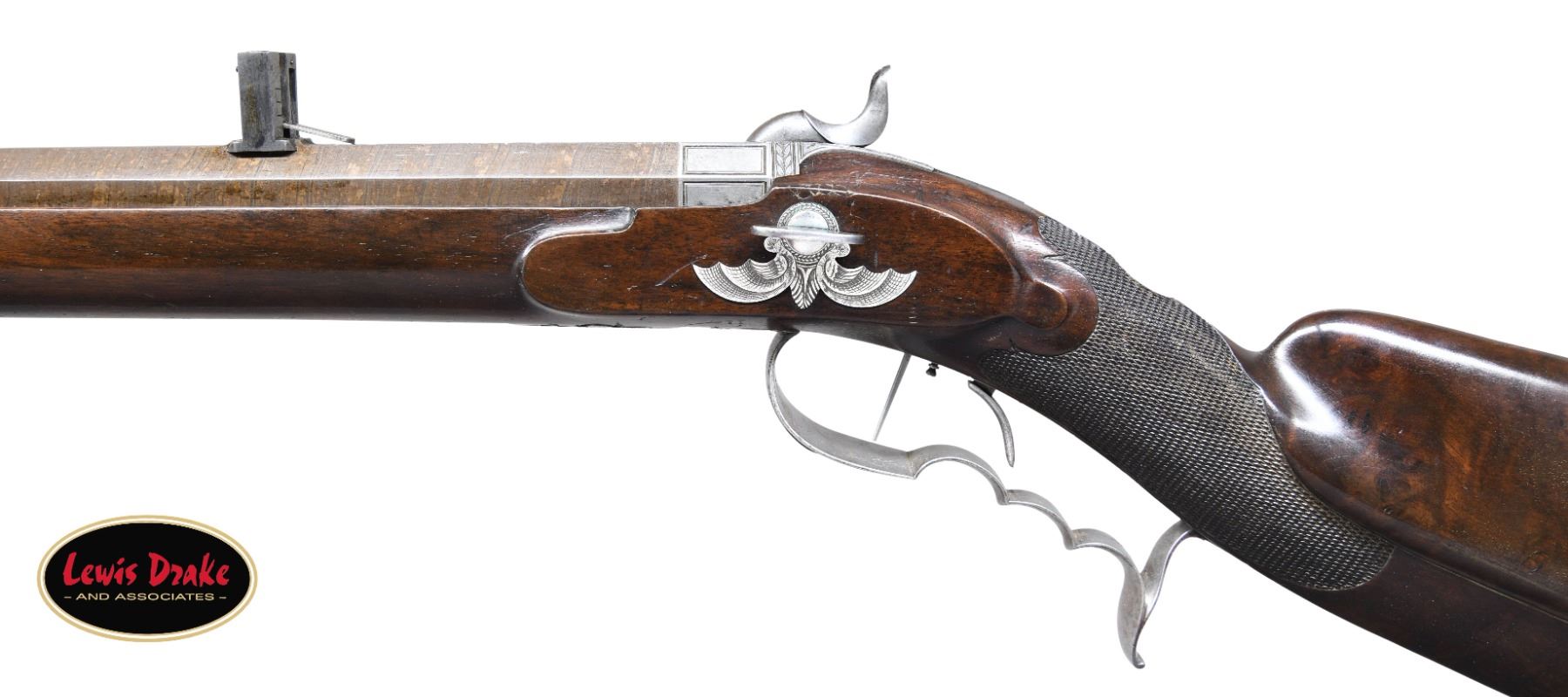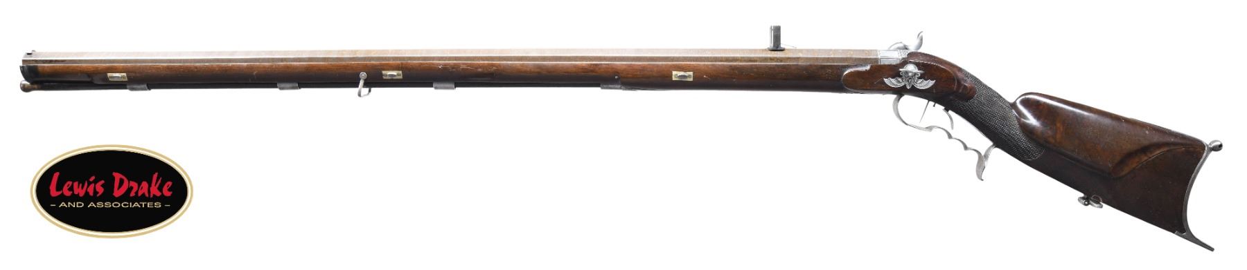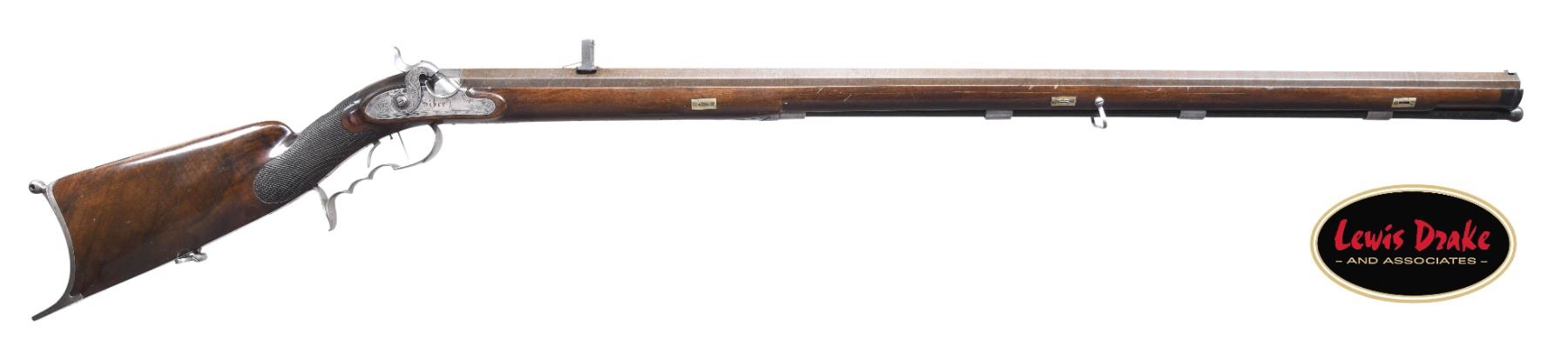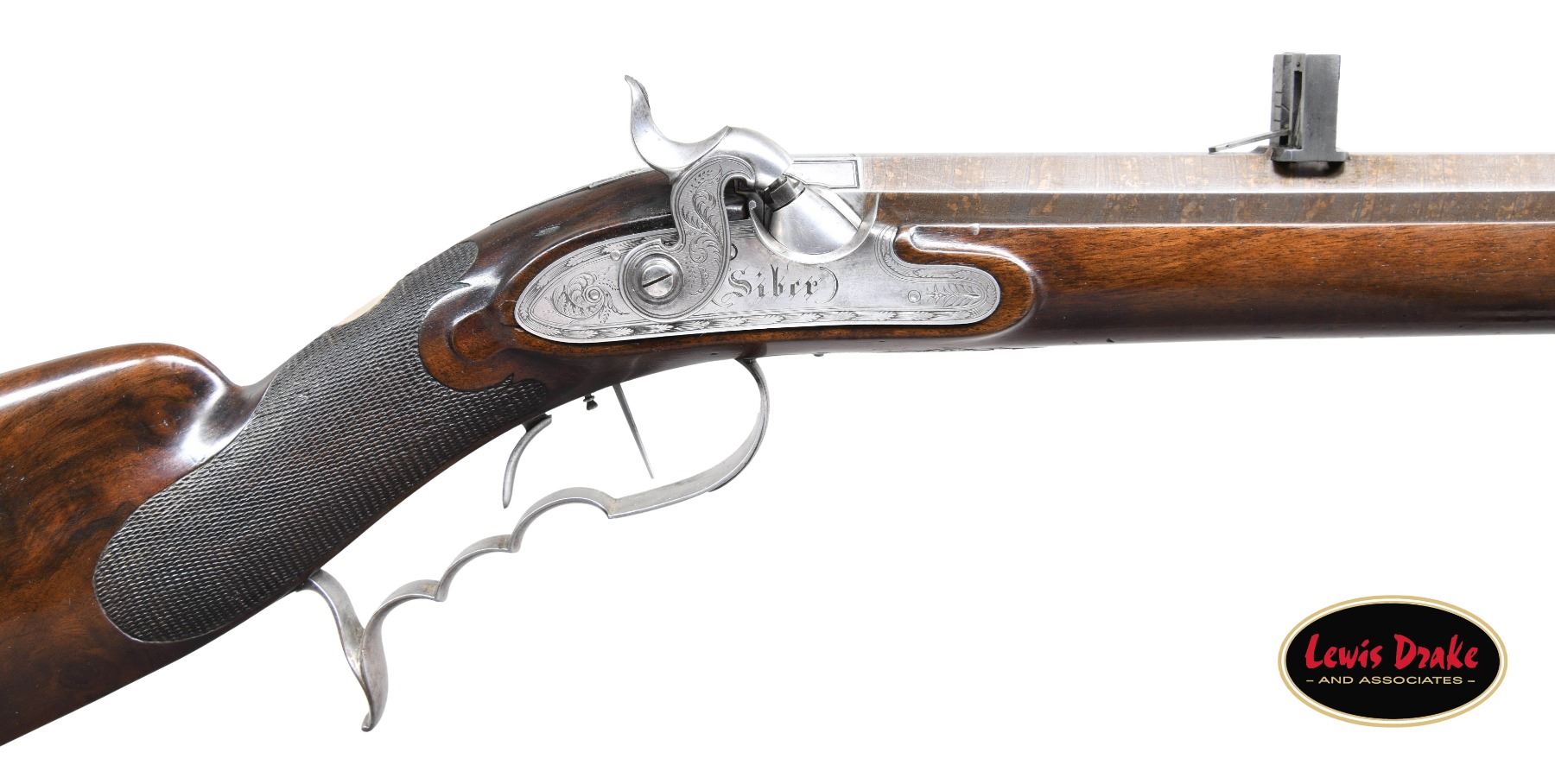 RIFLE BY SIBER OF LAUSANNE, SWITZERLAND. Cal. 65 Cal Multi-groove rifling. S# NSN. The Siber family were gunmakers in Switzerland in the early to mid 19th Century. This well made heavy rifle has 37" twist steel octagon barrel fitted with unusual long range rear sight with flip up aperture and silver barley corn front sight. Heavy breech plug is well filed. Breech iron is engraved with scroll and blossoms. Lock with flat plate and integral fence is fitted with broad flat faced hammer. Lock is engraved with feather borders and well cut foliate scroll, "Siber" is at center. Triggers are set. Trigger guard with finger grooves and spur has vase shaped finial which is nicely engraved with scroll and leaves. Trigger guard bow has stand of arms. Dense, lightly figured European walnut stock extends to muzzle with horn tip and attaches to barrel with three captive bolts. Stock features right hand cheekpiece and fancy borderless checkering at grip. Hook type steel off-hand buttplate is engraved with stars and scroll. A vacant silver oval is at top of grip. Ebony ramrod with horn tip mounts through three plain pipes and matching thimble. Bat wing shaped and cobweb engraved sideplate holds wing type takedown screw for lock. CONDITION: very fine. Barrel retaining most of its original brown. Lock and other metal parts show light cleaning to silver gray with some remaining stains. Stock retains over 90% of its original finish with some light marks. There is a 16" stress crack along right side of barrel channel. Bore is bright and shiny. Lock is crisp. Set trigger works. PROVENANCE: from the renowned collection of quality sporting arms from Lewis Drake together with inventory of Lewis Drake Associates. (01-26104/MGM). ANTIQUE. $2,000-4,000.