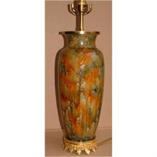 Stunning English Royal Doulton Vase of urn form, of impressive proportions, now converted to electric Table Lamp with ormolu base and mount. The main outer body with foliate decoration in Autumn colours on rustic ground. Base marks for 1922-1927. <P> In overall superb untouched condition with no chips anywhere. These lamps have been professionally re-wired for England or Ireland, could easily be changed for elsewhere. <p> Dimensions: Height: (entire as shown) 20.25" (51.5cm). Height: (top of porcelain) 15.5" (39cm). Diam: (base) 4.75"
