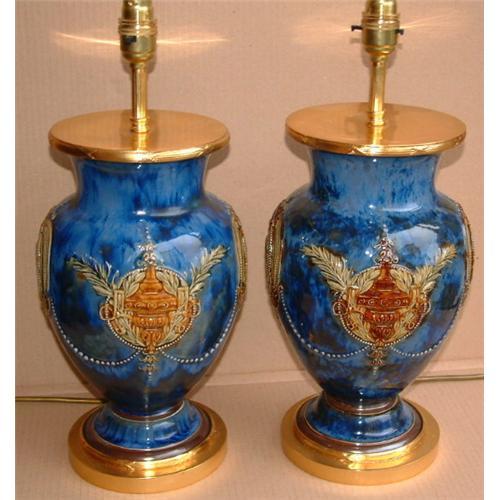 Stunning Pair of English Royal Doulton Vases urn form, of impressive proportions, now converted to electric Table Lamps with ormolu bases and mounts. The main outer bodies in mid blue ground with lavish applied decoration in colours, last quarter of the Nineteenth Century. <p> In overall superb untouched condition with no chips anywhere. These lamps have been professionally re-wired for England or Ireland, could easily be changed for elsewhere. <P> Dimensions: Height: (entire as shown) 17.25" (44cm). Height: (top of porcelain) 12.5" (32cm). Diam: (base) 6"