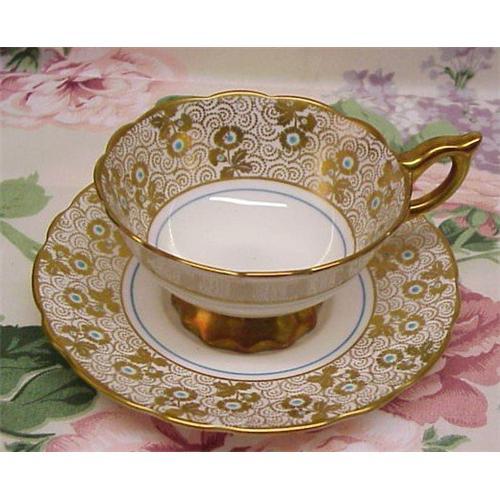 SUPERB AND UNIQUE CUP AND SAUCER MADE BY ROYAL STAFFORD OF ENGLAND, WITH EXQUISITE GOLD DECORATION ON INSIDE THE CUP, THIS IS WIDE OPEN TEACUP WITH GORGEOUS GOLD HANDLE AND FINELY SCALLOPED PEDESTAL, as per images - EXCELLENT CONDITION AND IT SEEMS NEVER USED,US BUYER TO PAY 7.00 FOR SHIPPING PLUS INSURANCE.THANKS.