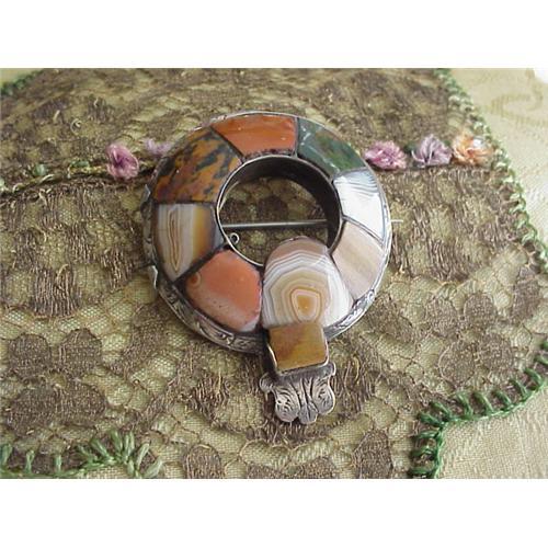 <table width="100%" border="0" cellspacing="0" cellpadding="4"><tr><td><em> </em></td></tr><tr> <td width="100%"> Dramatic and bold is how I would describe this gorgeous Scottish Victorian large garter design agate brooch! This Scottish beauty has a wonderful range of agates-Montrose grey, Jasper, Bloodstone etc! The shield design is surrounded by exquisite hand engraved silver. It measures a splendid 2 inches by 2 ½ inches, has a working c catch closure. The pin was re enforced at one point in time, an old repair and has a slight dent to the top of the brooch in the silver mounting, definitely not detracting, otherwise just lovely. This is a rich colourful circa 1860s Scottish brooch to proudly wear and add to your collection of Victorian agate jewelry. </td></tr><tr> <td> </td></tr><tr> <td>Reference #: GAVJ838</td></tr><tr><td>Condition:Very Nice!</td></tr><tr><td>Year:1860s</td></tr><tr><td>Title:SUPERB Victorian Scottish Agate Brooch</td></tr><tr><td>Location:WA</td></tr></table>