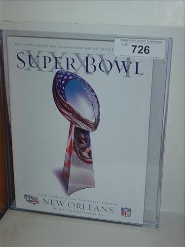 THE OFFICIAL GAME PROGRAM FROM SUPERBOWL XXXVI IN NEW ORLEANS. FEB. 3, 2002. ST. LOUIS RAMS VS. NEW ENGLAND PATRIOTS. AS SHOWN. VIEW PICTURE FOR DETAIL.