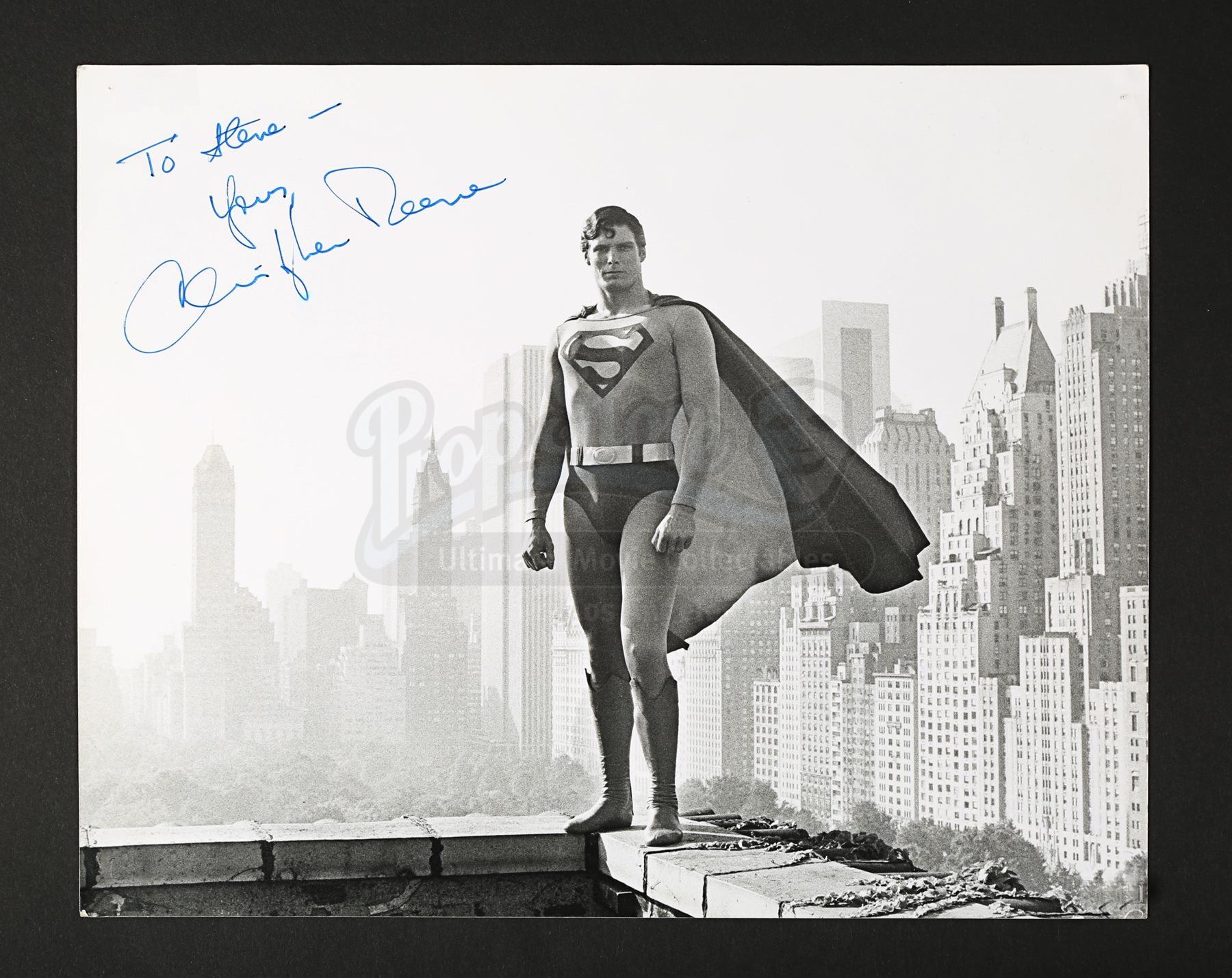 An autographed photograph of Christopher Reeve from the promotion of Richard Donner’s 1978 superhero film Superman. This arresting 8” x 10” black-and-white publicity still depicts Reeve in full costume as Superman, striking a strong pose on the parapet of a building against a New York cityscape, his cape flowing in the breeze.