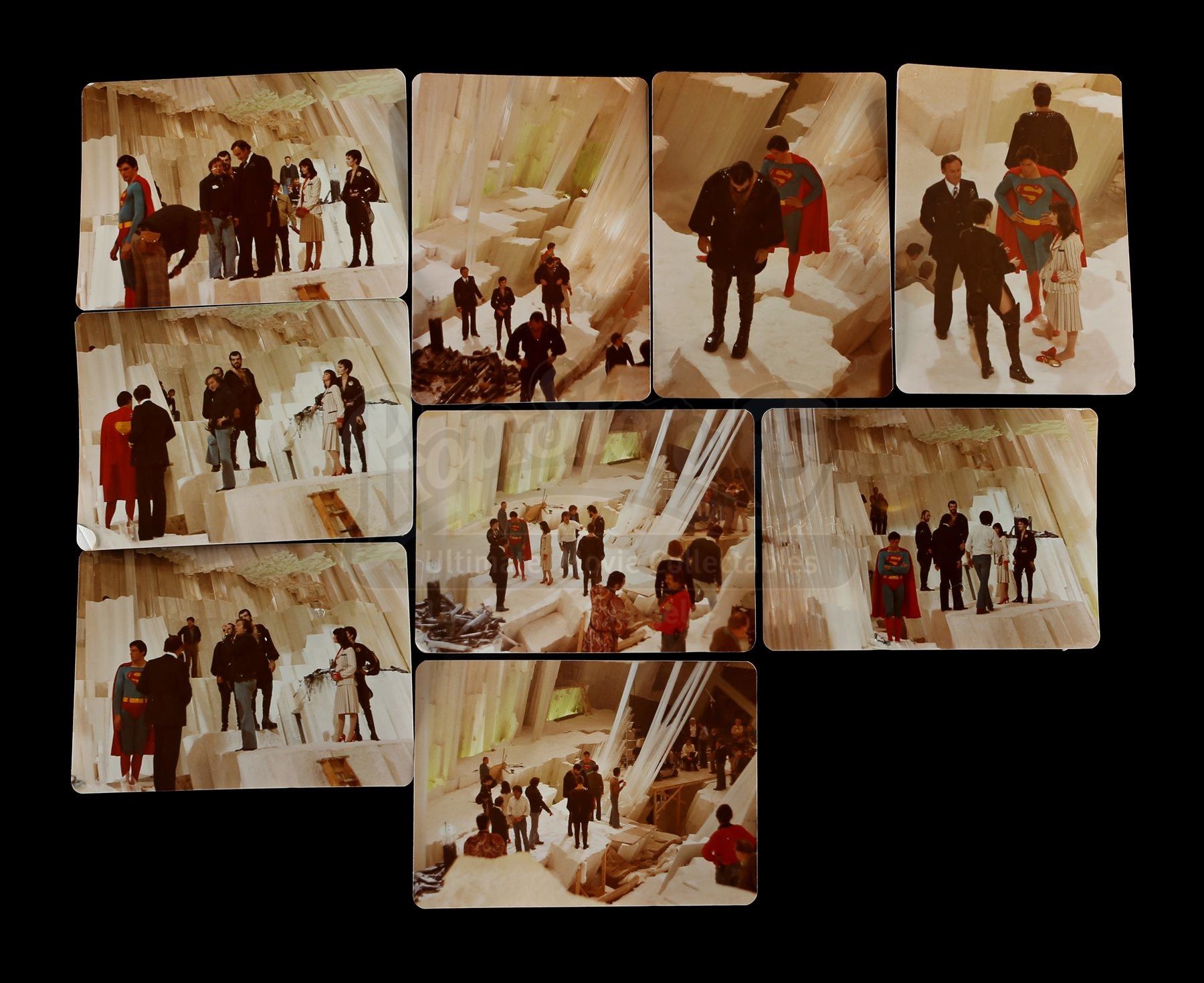 The nine small behind-the-scenes color photographs are from Superman II, showing Superman (Christopher Reeve), Lex Luthor (Gene Hackman), Lois Lane (Margot Kidder), General Zod (Terence Stamp) and others inside the Fortress of Solitude.